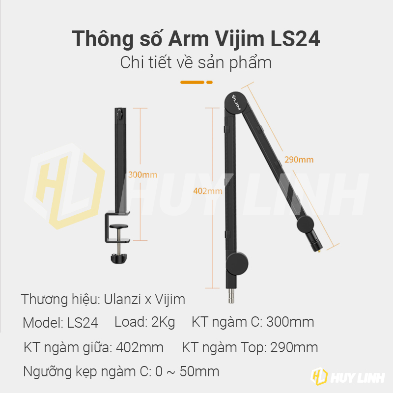 - Kích thước mỗi đoạn cụ thể như sau: Ngàm C 300mm, Đoạn giữa: 402mm, Arm Top: 230mm