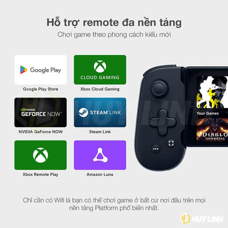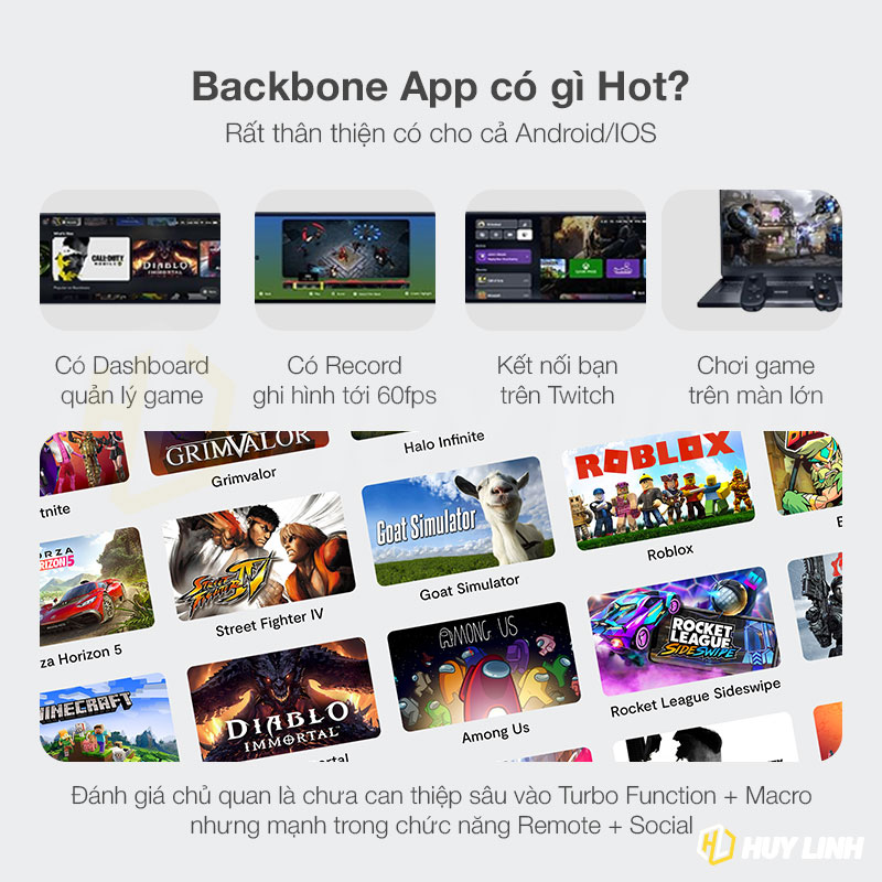 - APP STORE Backbone One hoạt động tốt với các trò chơi khác trên App Store và các trò chơi từ dịch vụ Streaming khác như Xbox Remote Play, Google’s Stadia, Nvidia GeForce Now và Amazon Luna.