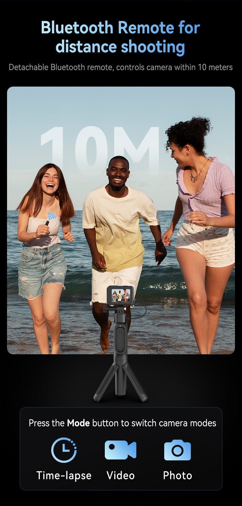 - Remote Bluetooth rời, có thể điều khiển camera từ xa 10 mét