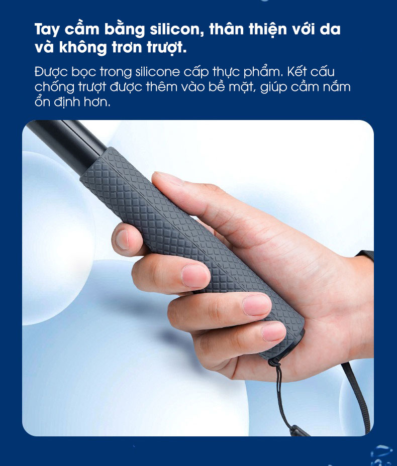 - Được bọc trong silicone cấp thực phẩm. Kết cấu chống trượt được thêm vào bề mặt, giúp cầm ổn định hơn.
