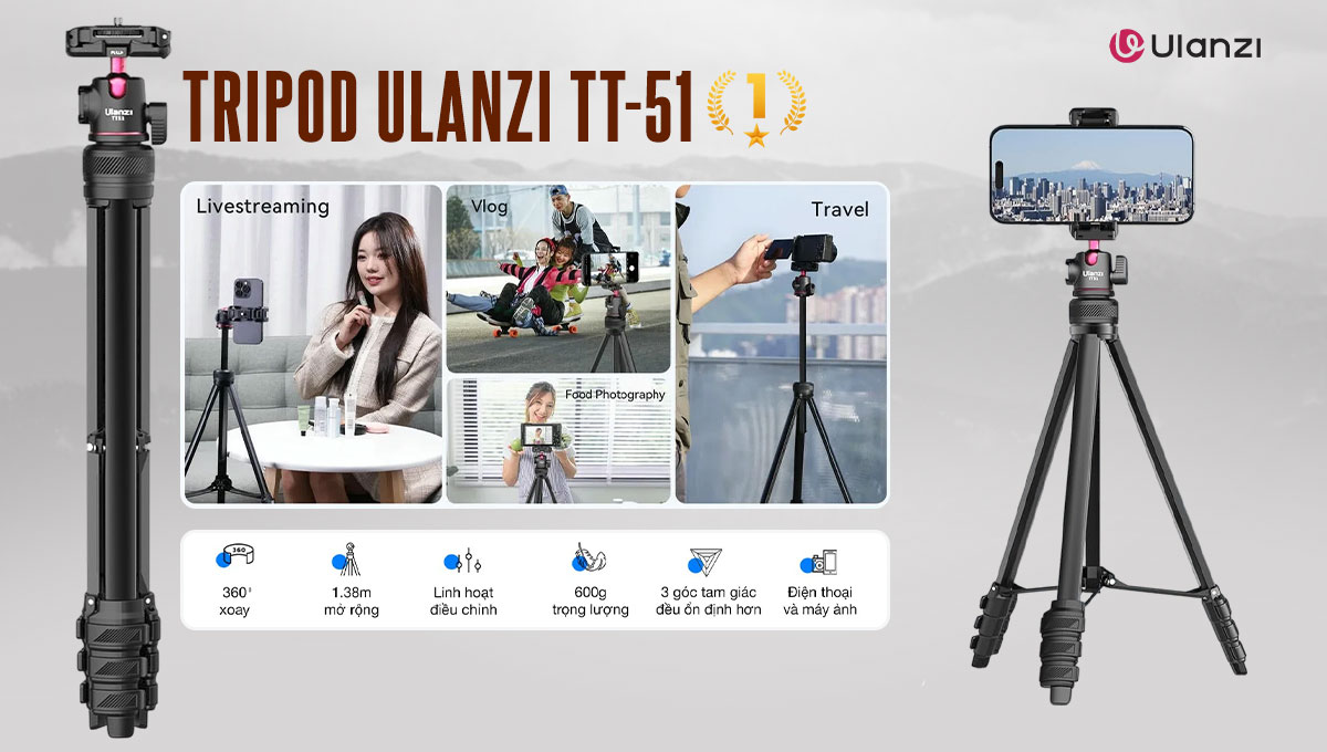 Ulanzi TT-51 là một chân máy mini gọn nhẹ, được thiết kế để mang lại sự chắc chắn hơn cho người dùng điện thoại và máy ảnh mirrorless nhỏ. Điểm mạnh của sản phẩm này là được làm từ hợp kim nhôm, bền bỉ hơn hẳn các loại tripod nhựa thông thường. Nó rất lý tưởng cho các buổi quay vlog hay du lịch nhờ kích thước nhỏ gọn và dễ dàng lắp đặt. Tuy nhiên, TT-51 có nhược điểm là tải trọng hạn chế, chỉ khoảng 1.3kg, nên không phù hợp với các máy ảnh DSLR và ống kính nặng. Hơn nữa, chiều cao của nó khá thấp, chỉ thích hợp để sử dụng trên bàn hoặc mặt phẳng.