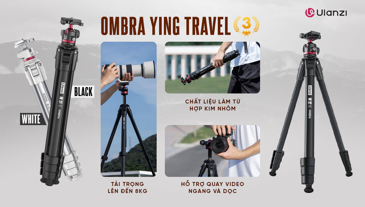 Ulanzi Ombra Ying II là một chiếc chân máy du lịch cao cấp, sở hữu hai màu sắc Travel Tripod Ulanzi Ombra Ying II White và Travel Tripod Ulanzi Ombra Ying II Black thiết kế lý tưởng cho những người cần sự kết hợp giữa trọng lượng nhẹ và độ bền. Điểm mạnh lớn nhất của nó là được làm từ hợp kim nhôm (aluminum alloy) kết hợp nhựa cao cấp (ABS), chỉ nặng khoảng 1.3kg nhưng có khả năng chịu tải lên tới 15kg. Chiếc tripod này còn rất linh hoạt, có thể biến thành monopod tiện lợi và chụp ảnh góc thấp nhờ trục giữa đảo ngược. Mặc dù sở hữu nhiều ưu điểm vượt trội, nhược điểm chính của sản phẩm này là mức giá cao hơn đáng kể so với các loại tripod làm từ hợp kim nhôm, khiến nó trở thành một khoản đầu tư đáng cân nhắc.