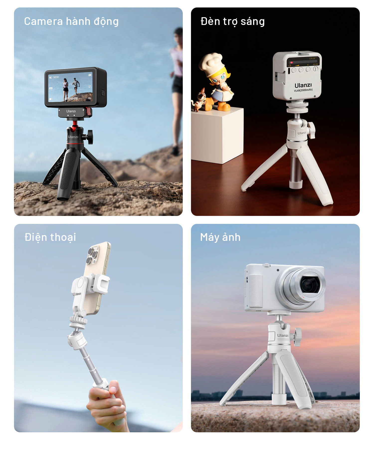 - Kít 4: Bao gồm Tripod Ulanzi MT08 + Kẹp điện thoại Ulanzi ST07 + Đèn Ulanzi VL49 RGB + Ngàm mở rộng Ulanzi PT-8