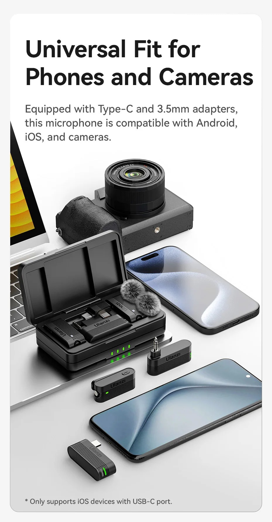 - Được trang bị bộ chuyển đổi Type-C và 3,5 mm, micrô này tương thích với Android, iOS và máy ảnh.