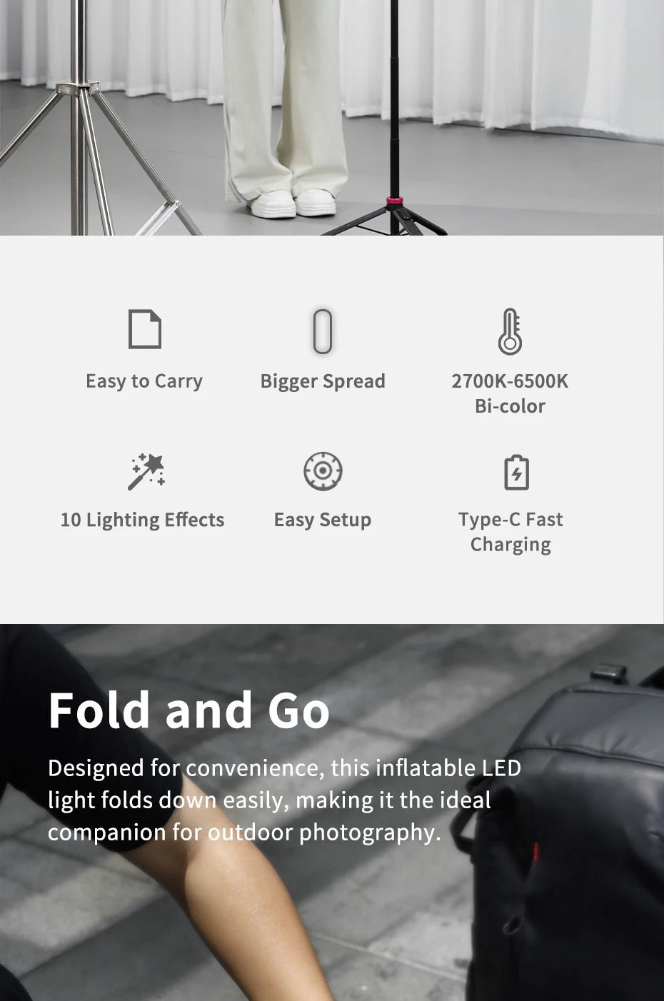 - Nó có thể được gấp lại và cất giữ sau khi sử dụng, nhẹ và nhỏ, dễ dàng mang theo khi chụp ngoài trời.