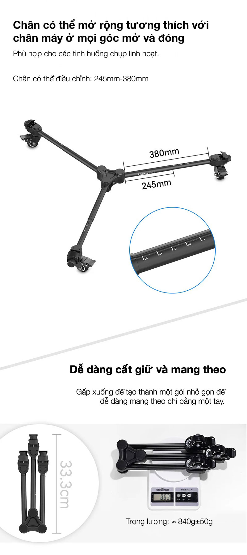 - Kích thước mở rộng: 245 ~ 380mm