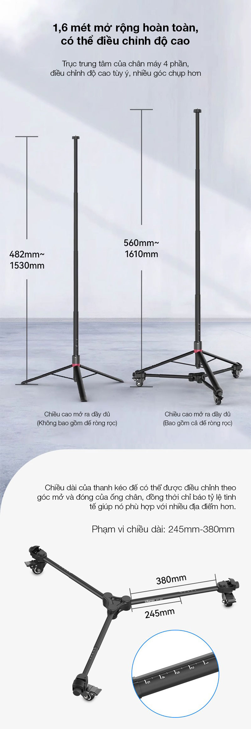 - Kích thước mở rộng: 245 ~ 380mm