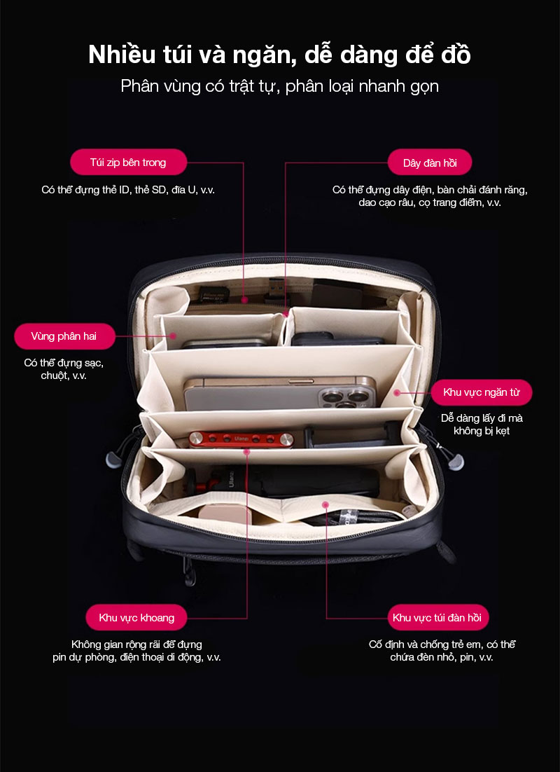 - Kết cấu nhiều ngăn, hỗ trợ sắp xếp phụ kiện ngăn nắp.