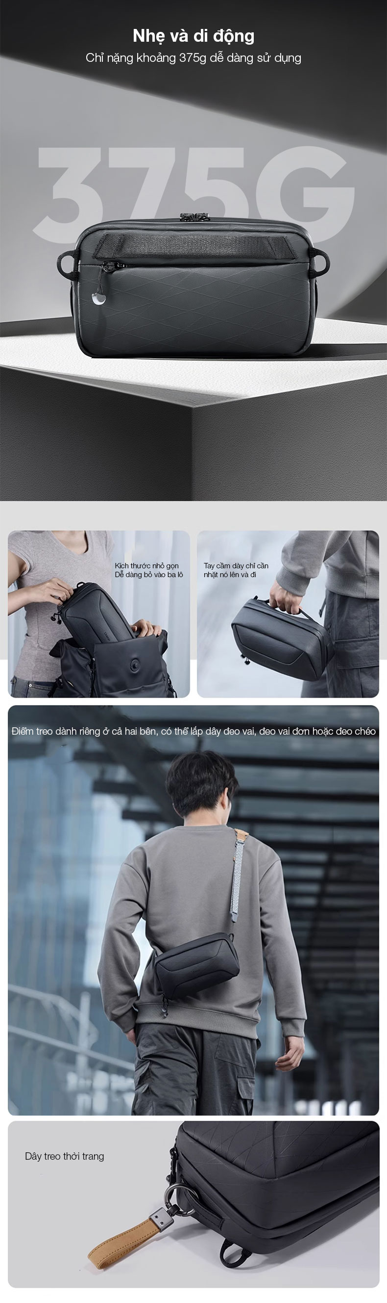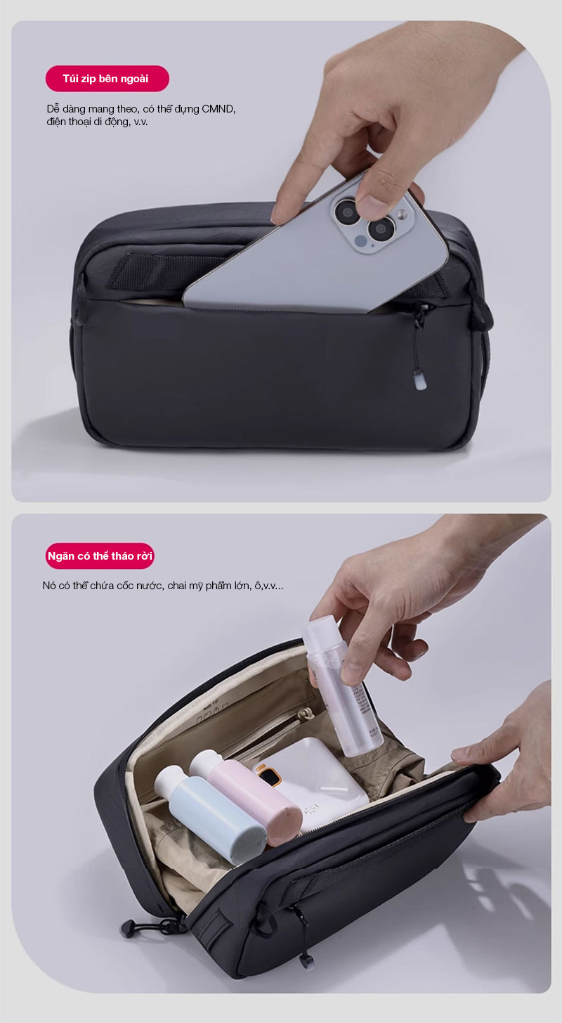 - Thiết kế nhỏ gọn, có thể bỏ vào balo hoặc kết hợp với dây đeo vai, dễ dàng mang theo