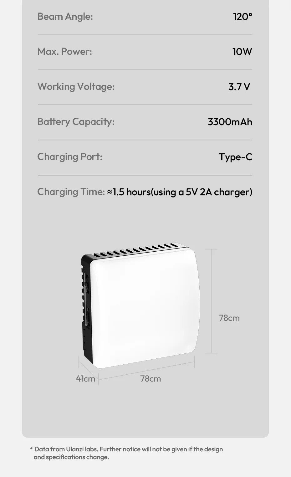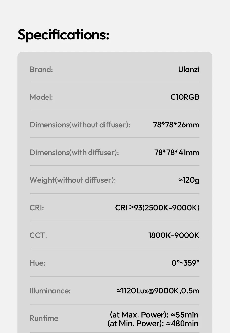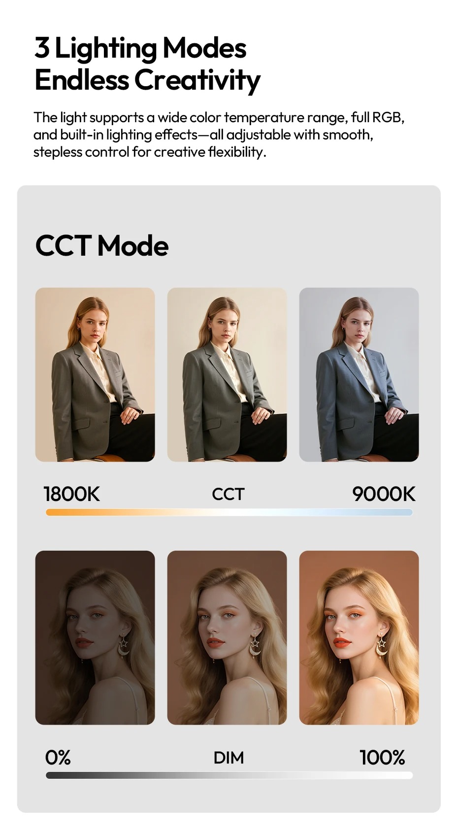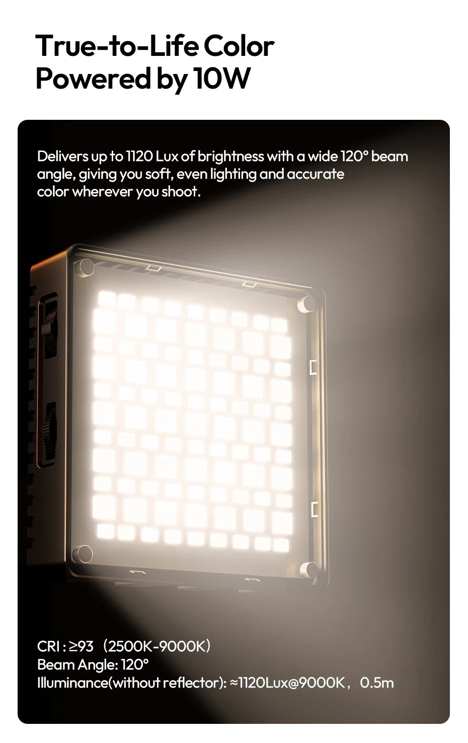 - Độ sáng (không softbox): ≈1120Lux@9000K, 0.5m