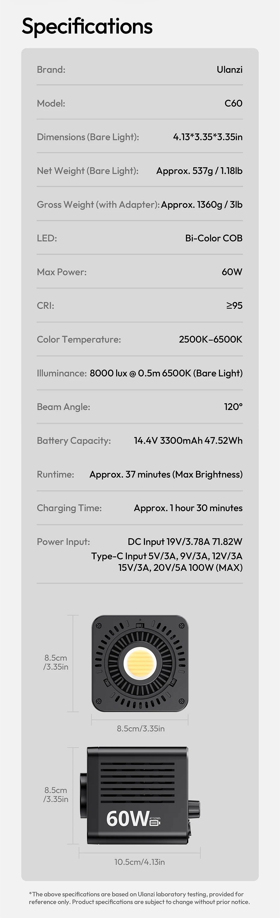 - Độ rọi (Illuminance): 8000 lux @ 0.5m 6500K (Chỉ đèn)