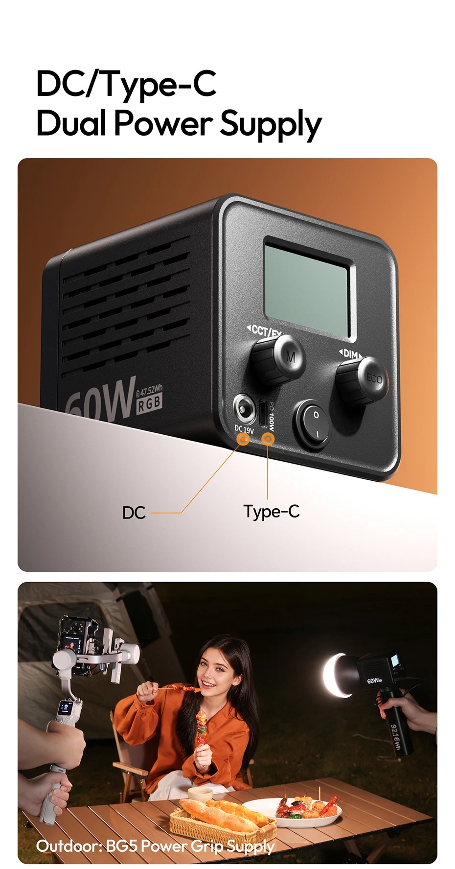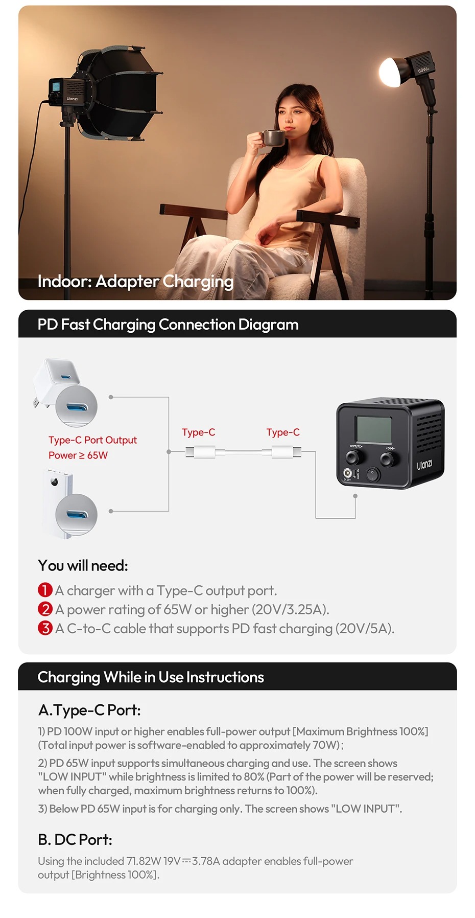 + Type-C Input: 5V/3A, 9V/3A, 12V/3A, 15V/3A, 20V/5A 100W (Tối đa)
