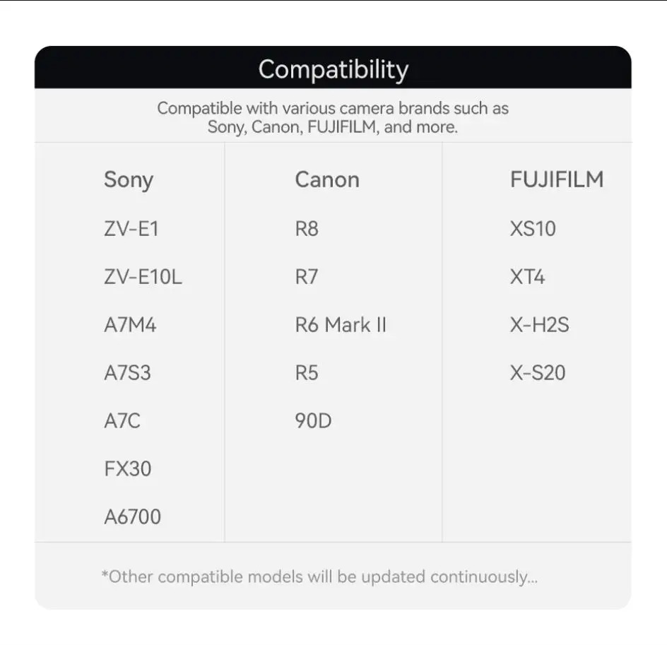 - Tương thích với các dòng máy ảnh như Sony ZV-E1 / ZV-E10L / a7 IV/ a7S III/ A7C / FX30 / A6700, Canon R8 / R7 / R6 Mark II / R5 / 90D, FUJIFILM XS10 / XT4 / X-H2S / X- S20, v.v.