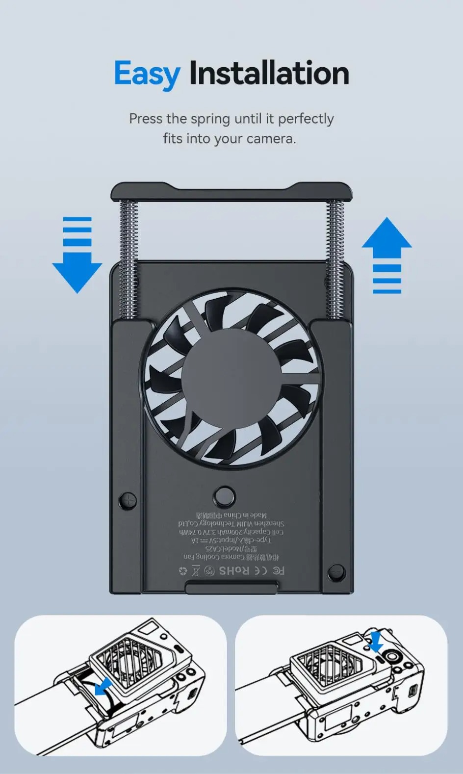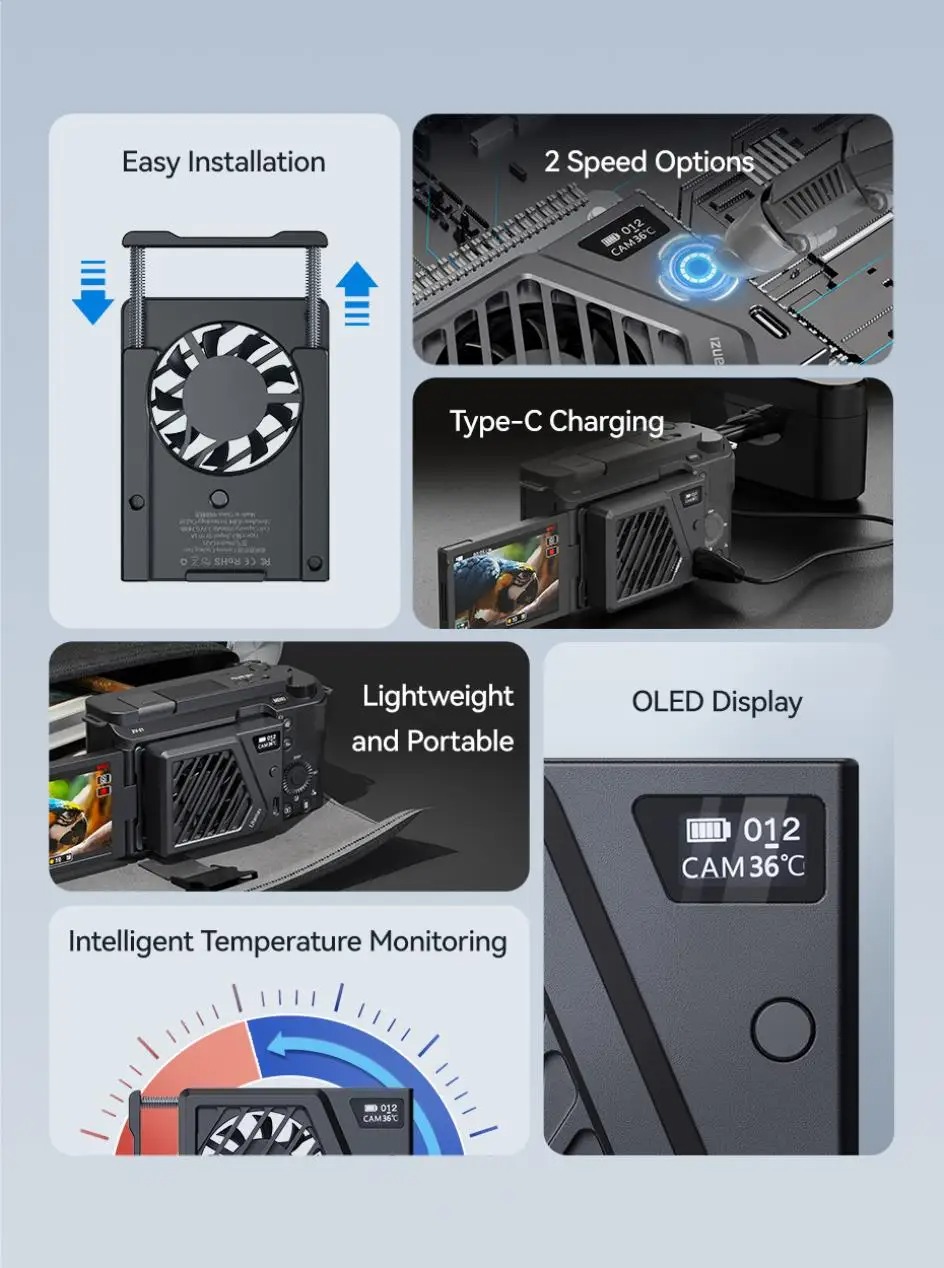 - Tương thích: Sony ZV-E1 / ZV-E10L / A7M4 / A7S3 / A7C / FX30 / A6700, Canon R8 / R7 / R6 Mark Il / R5 / 90D, FUJIFILM XS10 / XT4 / X-H2S / X-S20, v.v. Quạt Làm Mát Máy Ảnh Ulanzi Cho Sony / Canon / FUJIFILM