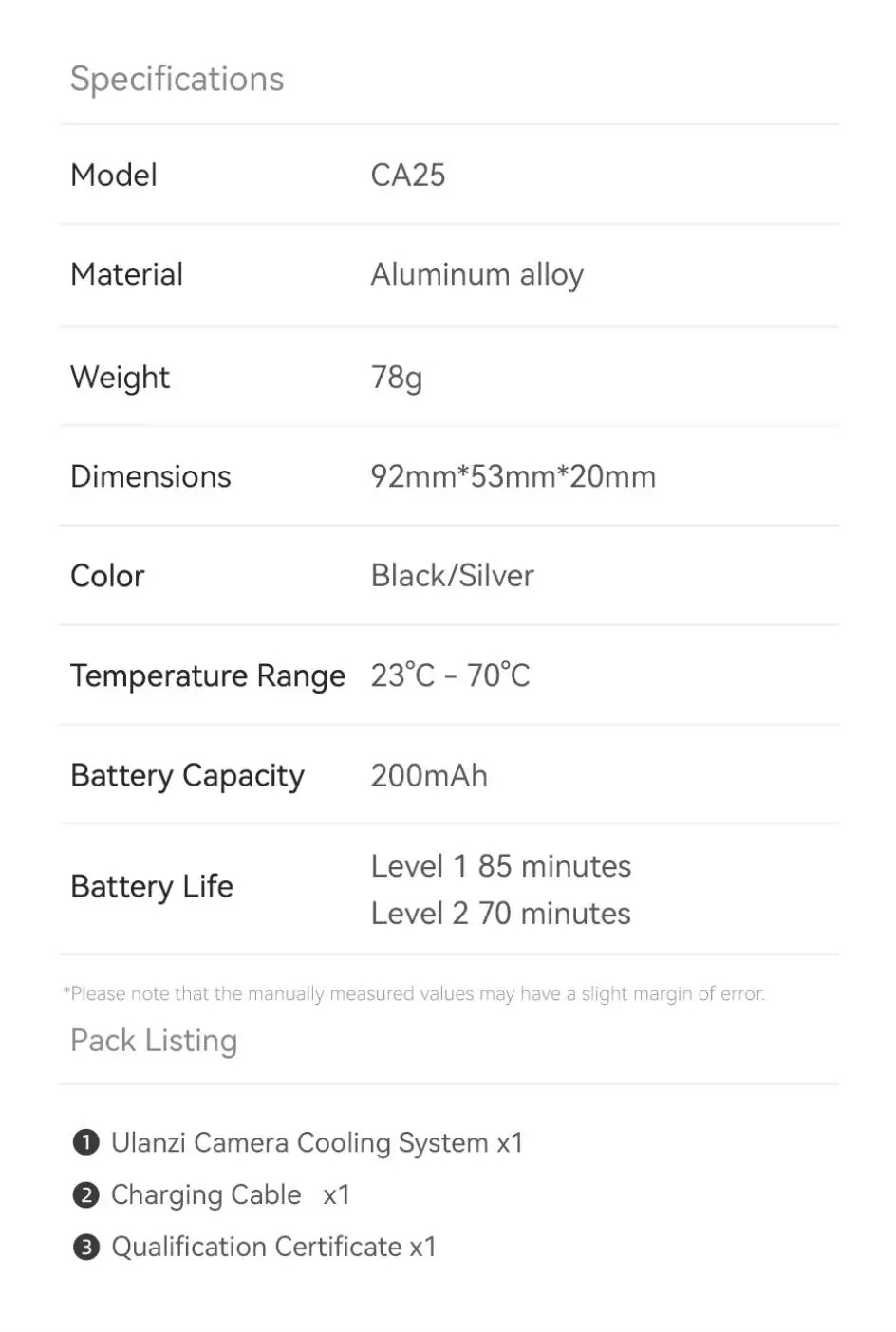 - 1 x Quạt làm mát máy ảnh / điện thoại Ulanzi CA25 Upgrade