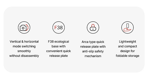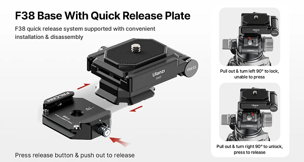 - Đế F38 với Tấm tháo nhanh Tấm Arca : Hệ thống tháo nhanh F38 được hỗ trợ lắp đặt và tháo gỡ thuận tiện.