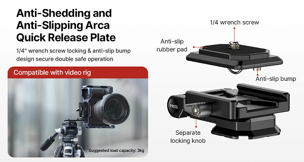 - Tấm tháo nhanh Arca chống bong tróc và chống trượt : Khóa vít cờ lê 1/4" & thiết kế va đập chống trượt đảm bảo vận hành an toàn gấp đôi.