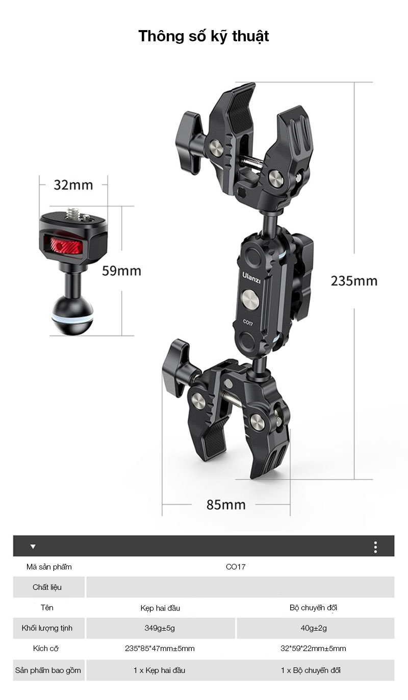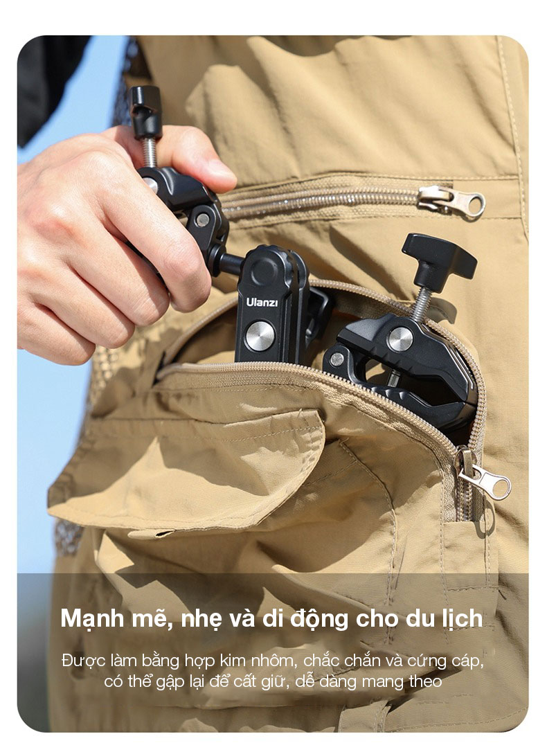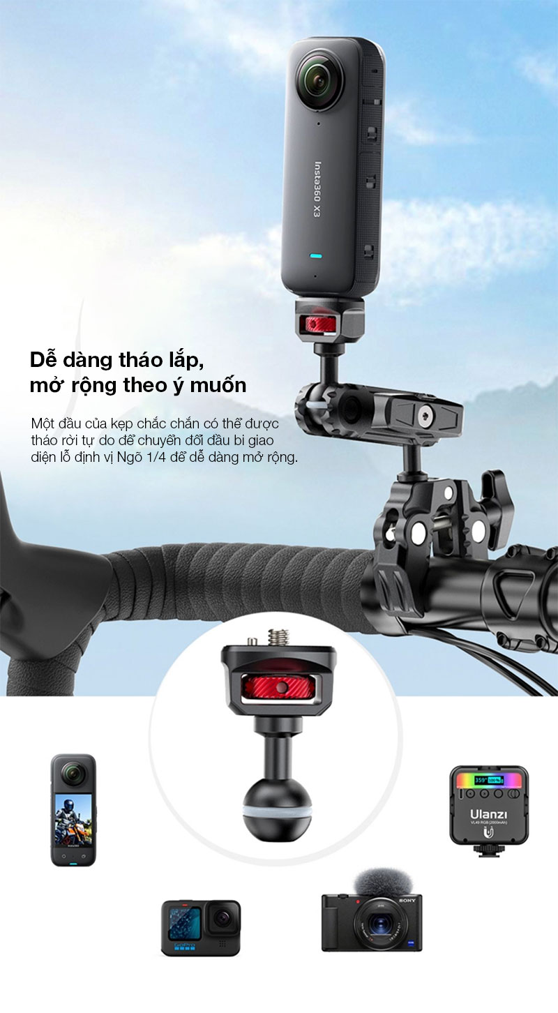 - Ulanzi CO17 Super Kẹp với Cánh tay ma thuật đầu bi kép. Siêu Kẹp đa năng này dễ dàng gắn vào xe máy, xe đạp, giá ba chân, bàn, v.v.