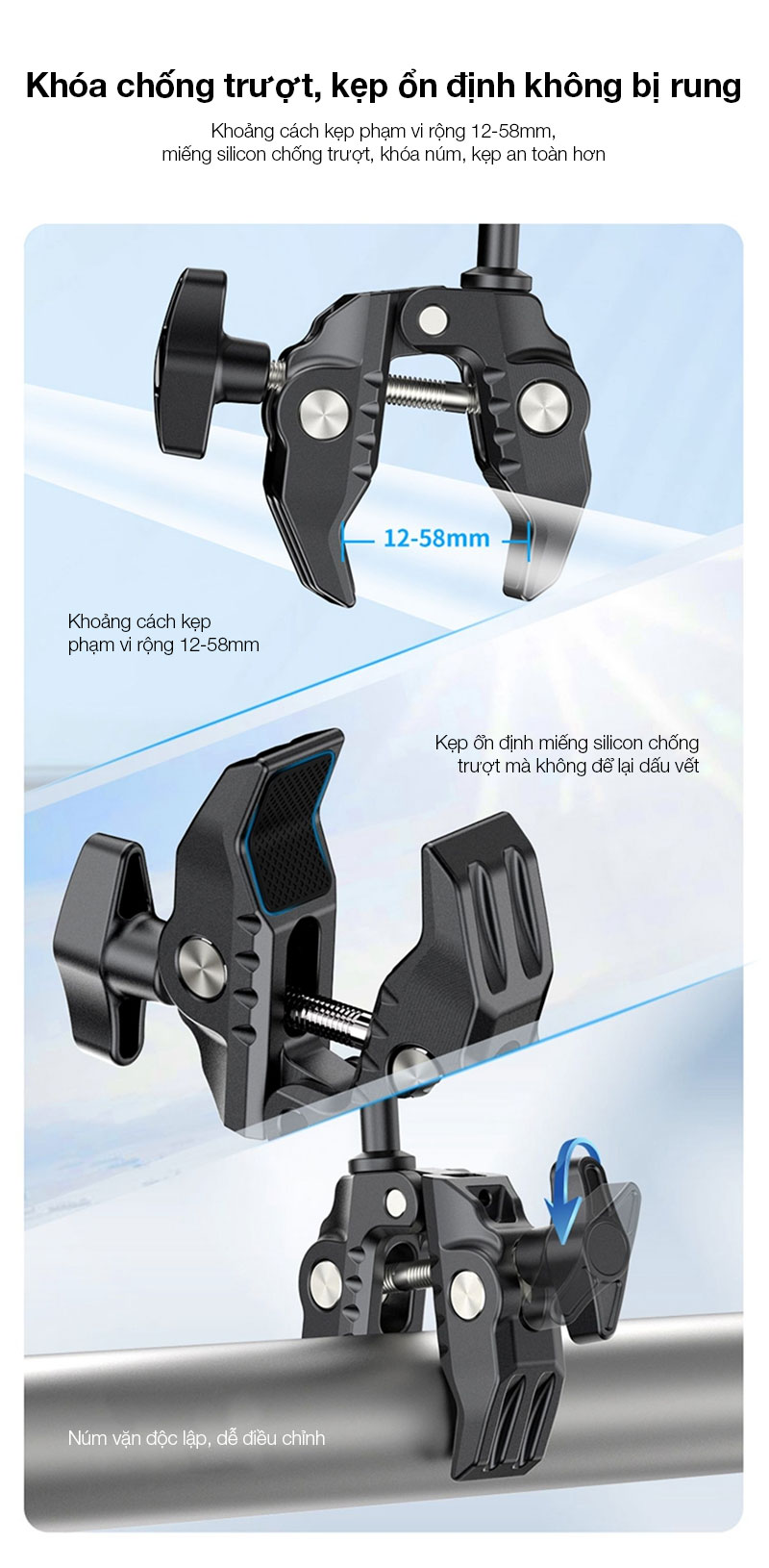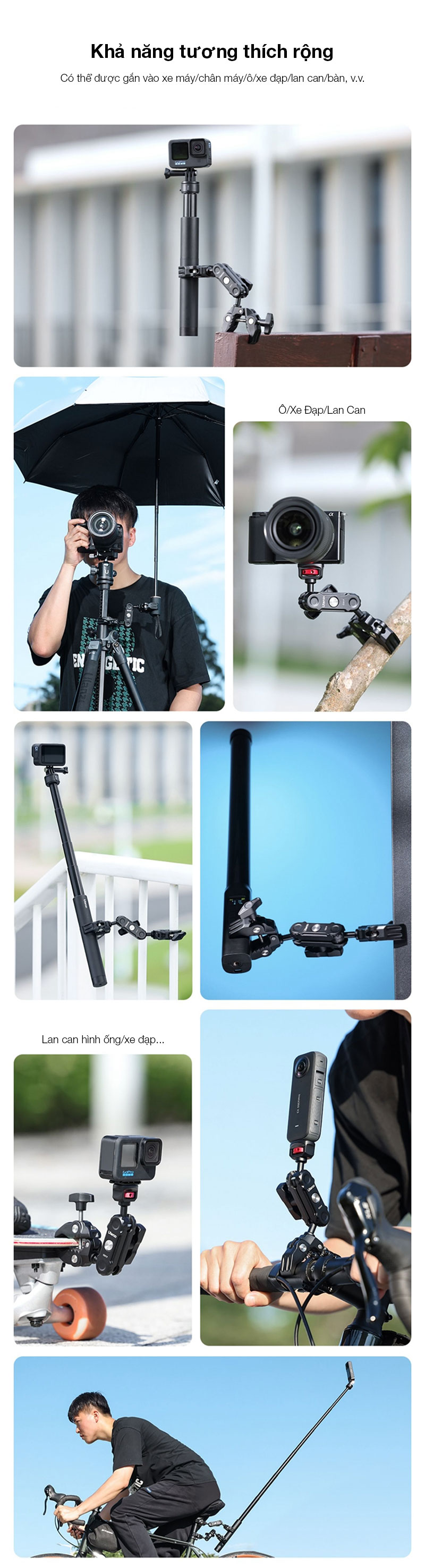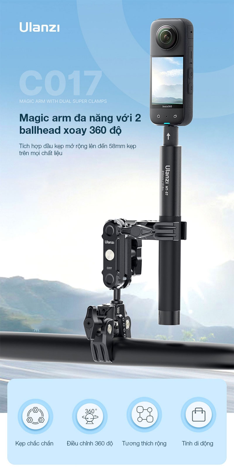 - Ulanzi CO17 Super Kẹp với Cánh tay ma thuật đầu bi kép. Siêu Kẹp đa năng này dễ dàng gắn vào xe máy, xe đạp, giá ba chân, bàn, v.v.