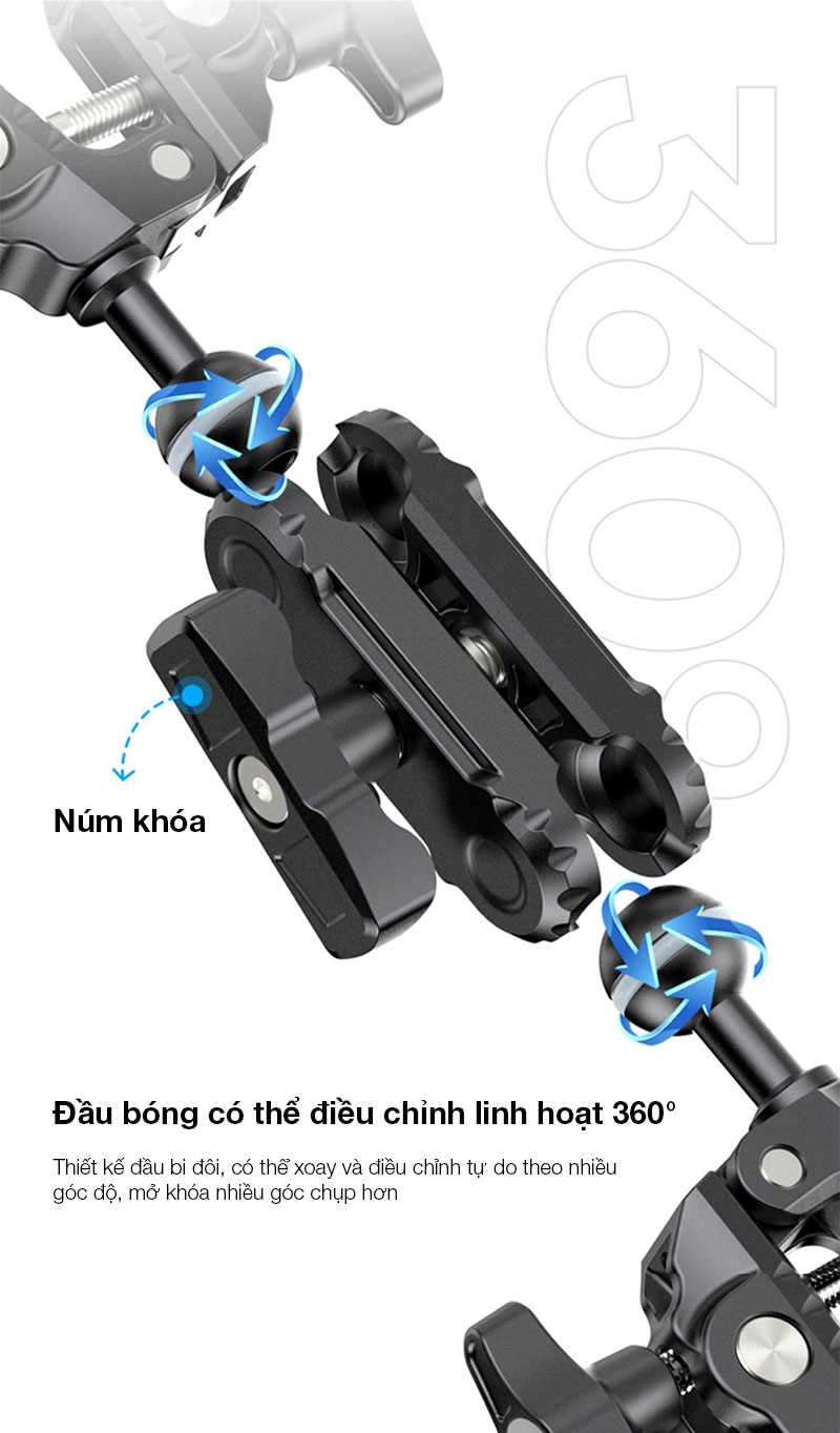 - Đầu bi kép có khả năng điều chỉnh 360° linh hoạt, mang đến các góc chụp linh hoạt. Bạn có thể chuyển đổi đầu bi để mở rộng các tùy chọn của mình với khả năng chịu tải 3,5kg.