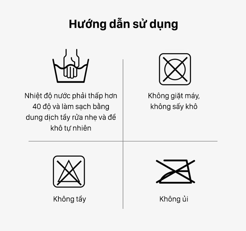 - Chỉ được giặt và phơi khô bằng tay, không dùng chất tẩy rửa và bàn ủi tiếp xúc với sản phẩm.