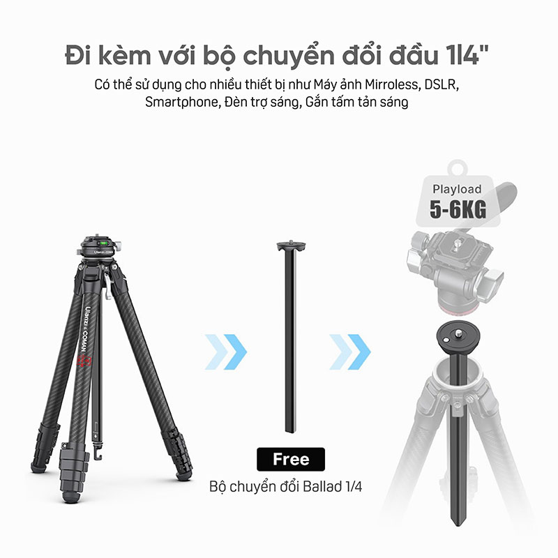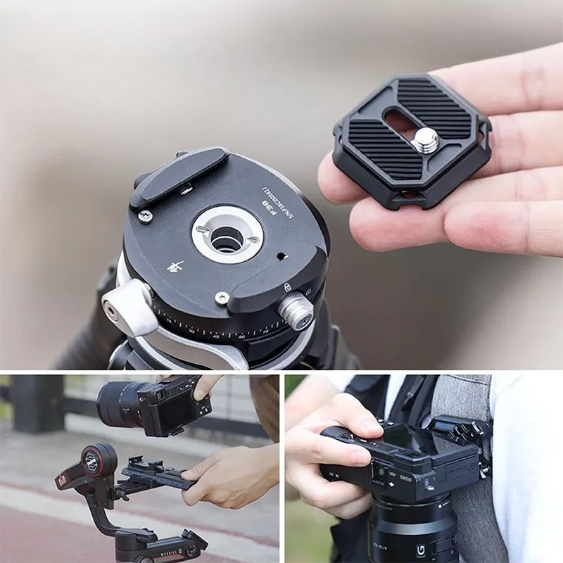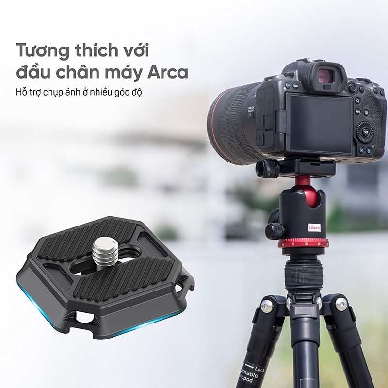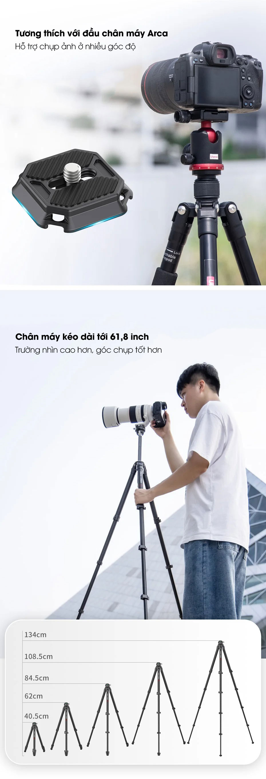 - Giao diện Quick Release với vít 1/4 có thể sử dụng cho nhiều thiết bị như Máy ảnh Mirroless, DSLR, Smartphone, Đèn trợ sáng, Gắn tấm tản sáng