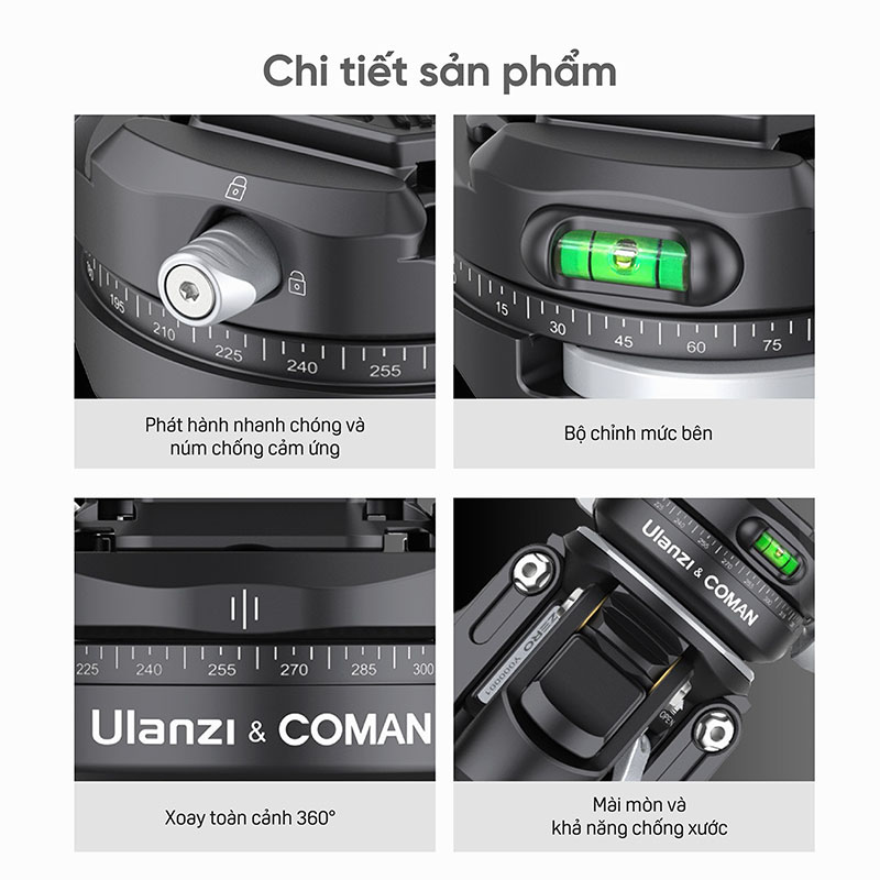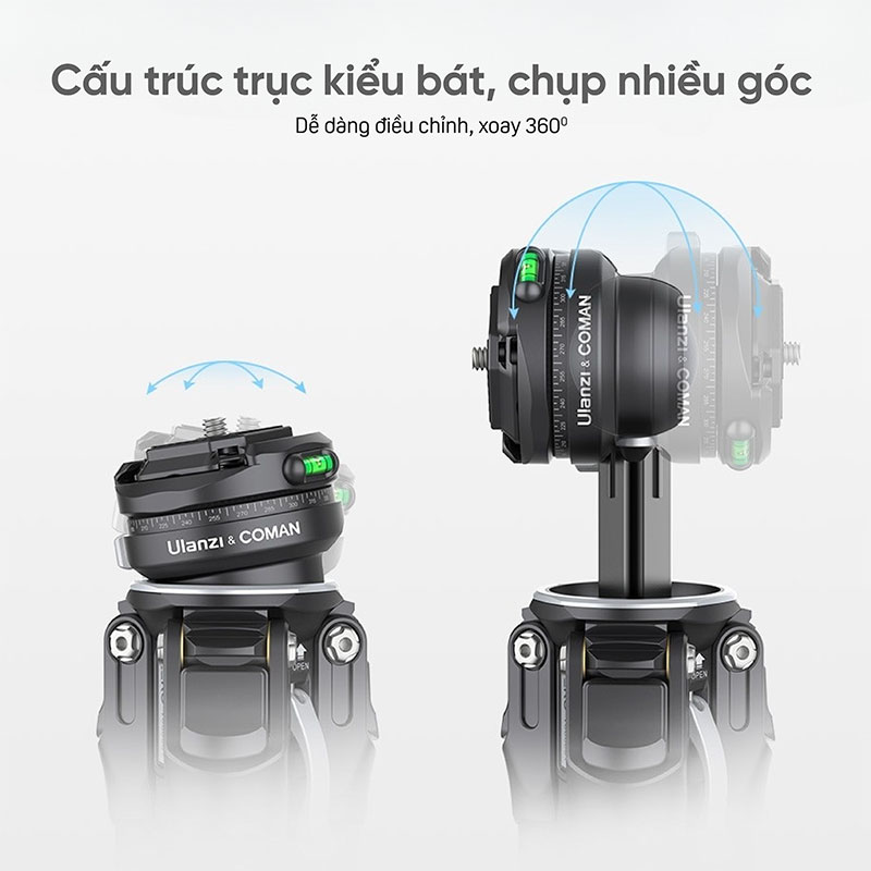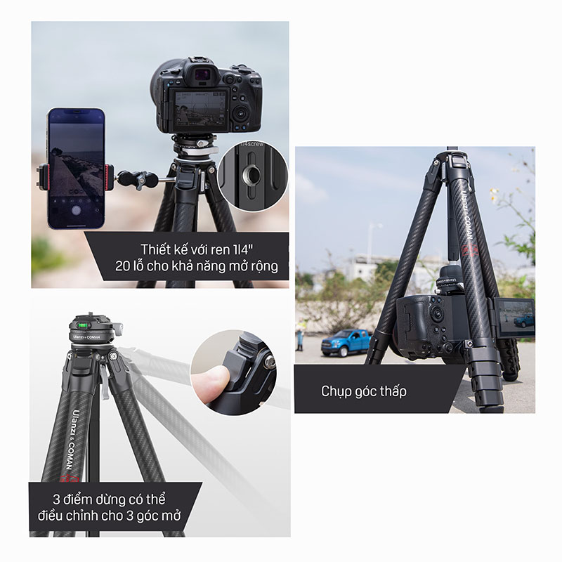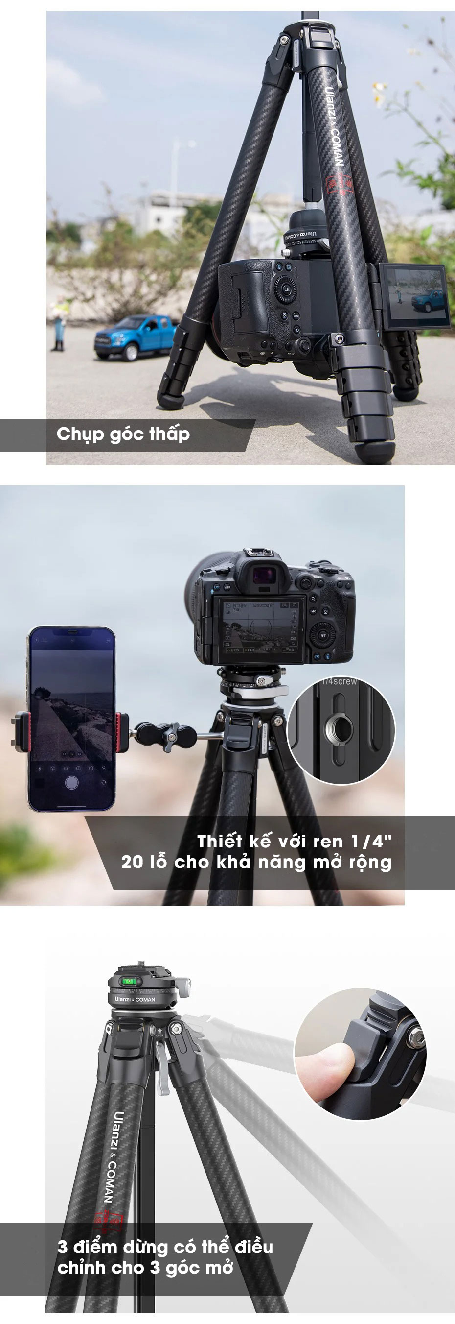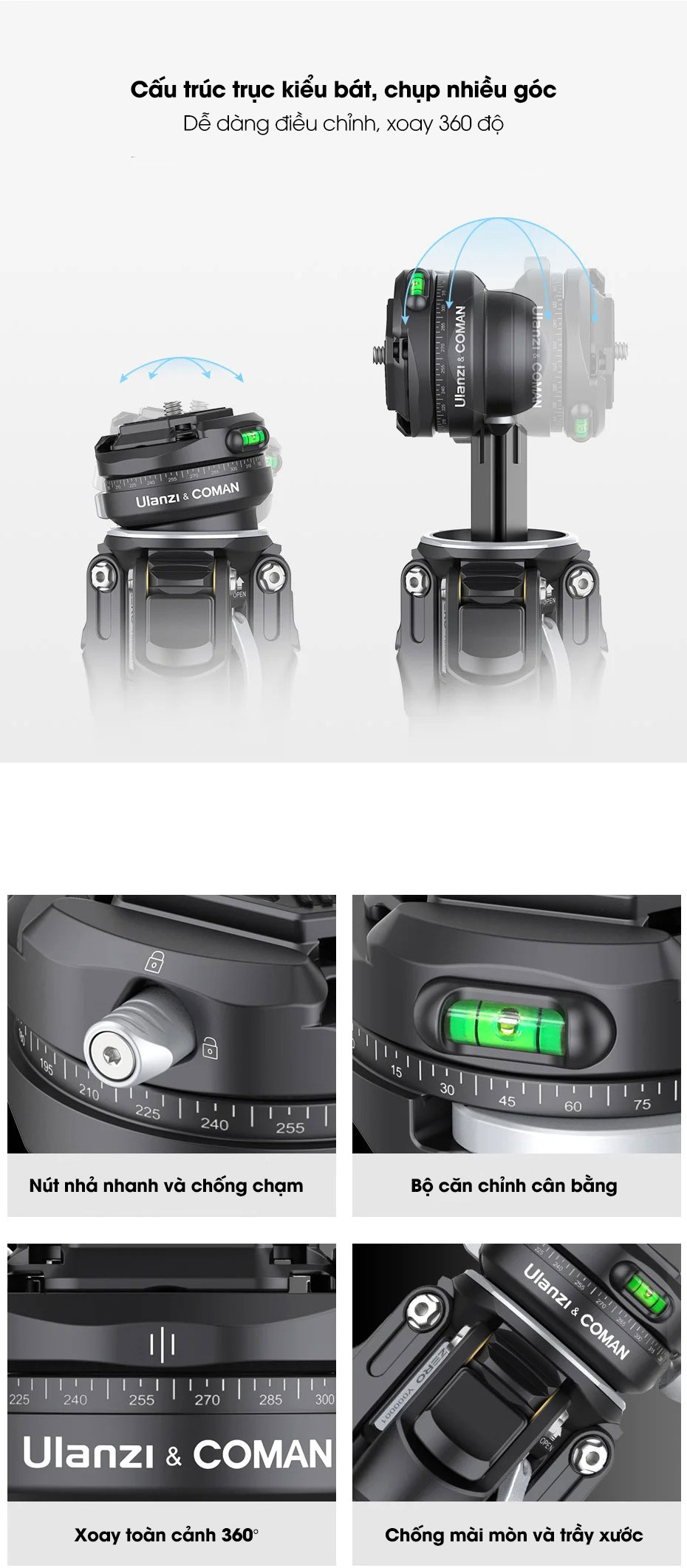 - Giao diện Quick Release với vít 1/4 có thể sử dụng cho nhiều thiết bị như Máy ảnh Mirroless, DSLR, Smartphone, Đèn trợ sáng, Gắn tấm tản sáng