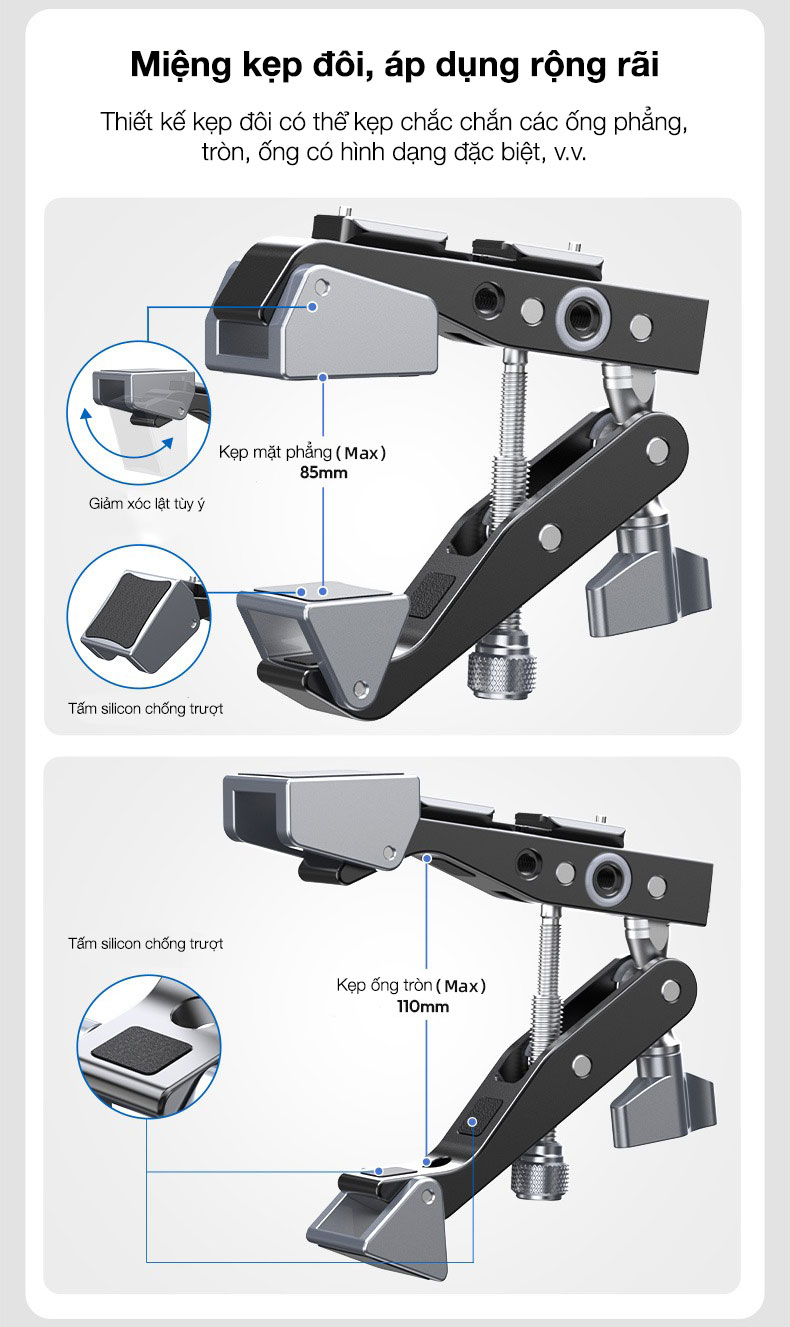 - Thiết kế kẹp đôi có thể kẹp chắc chắn các ống phẳng, tròn, ống có hình dạng đặc biệt, v.v
