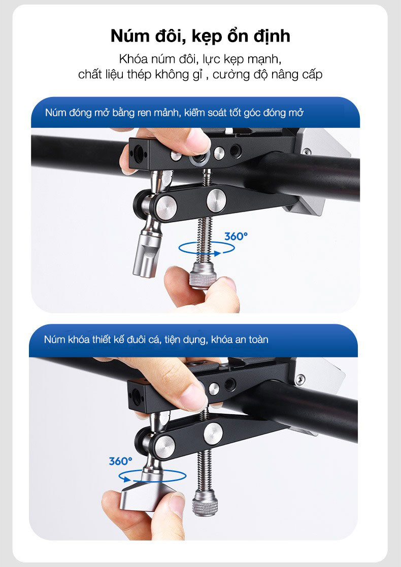 - Khóa núm đôi, lực kẹp mạnh, chất liệu thép không gỉ, cường độ nâng cấp