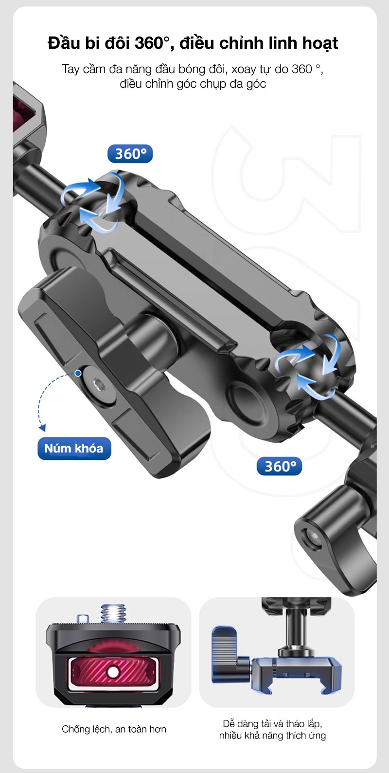 - Đầu bi đôi 360°, điều chỉnh linh hoạt