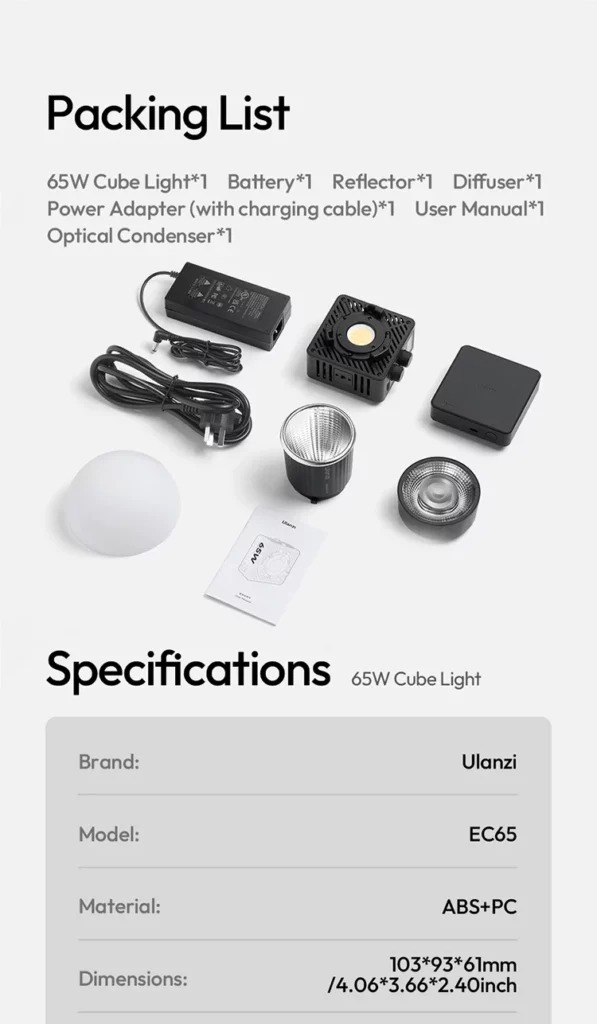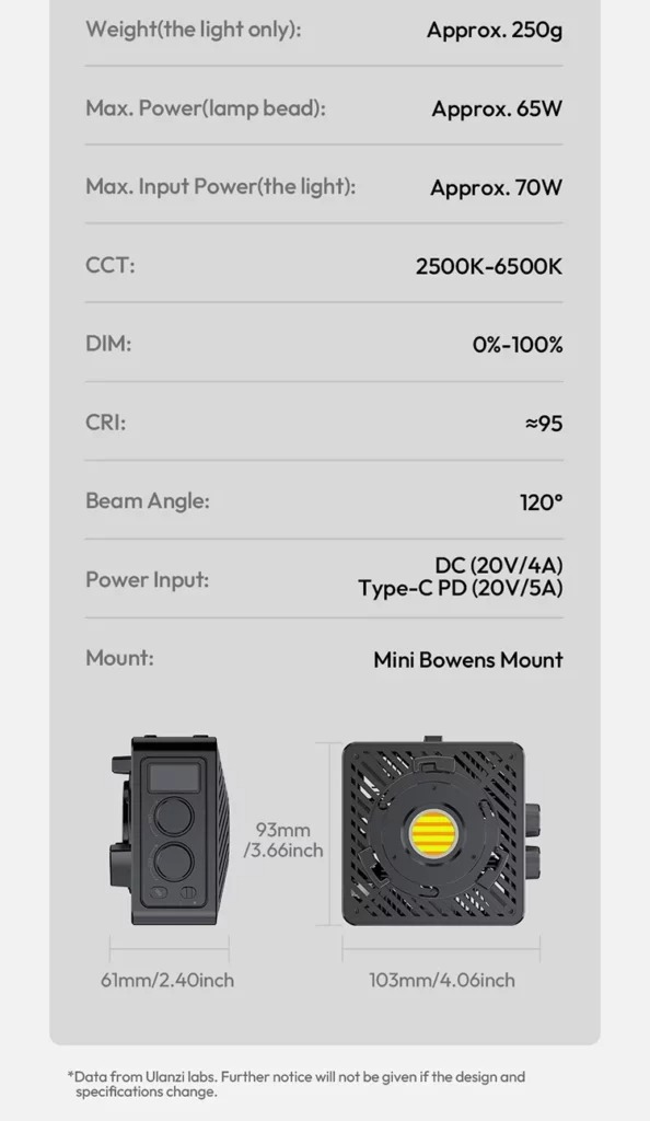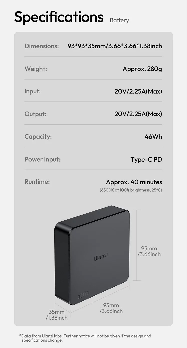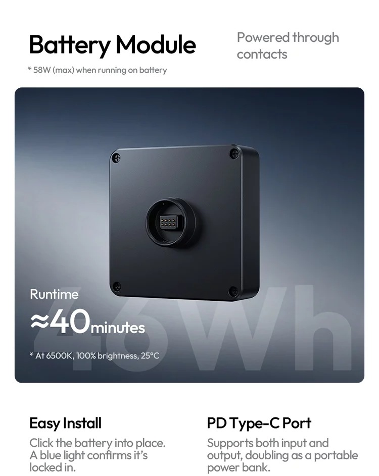 + Thời lượng hoạt động: Khoảng 40 phút (ở 6500K, độ sáng 100%, nhiệt độ 25°C)