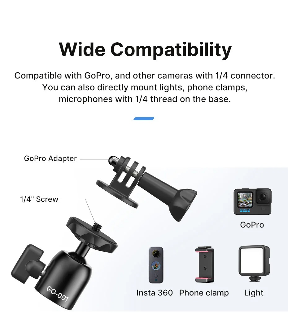 - Tương thích với hầu hết các loại camera hành động trên thị trường như Gopro, Action Cam, DJI Pocket, insta360.