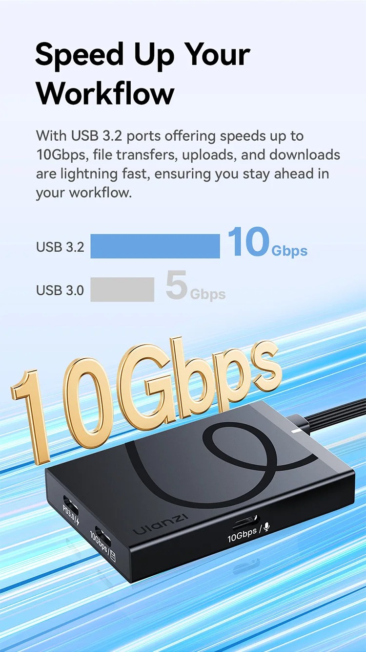 - Với cổng USB 3.2 cung cấp tốc độ lên đến 10Gbps, việc truyền tệp, tải lên và tải xuống diễn ra cực nhanh