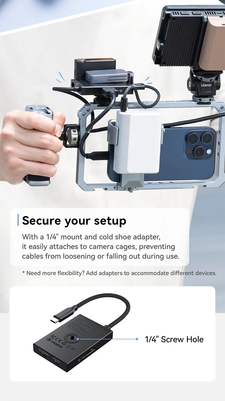 - Với ngàm 1/4" và bộ chuyển đổi Cold shoe, sản phẩm dễ dàng gắn vào khung máy ảnh,