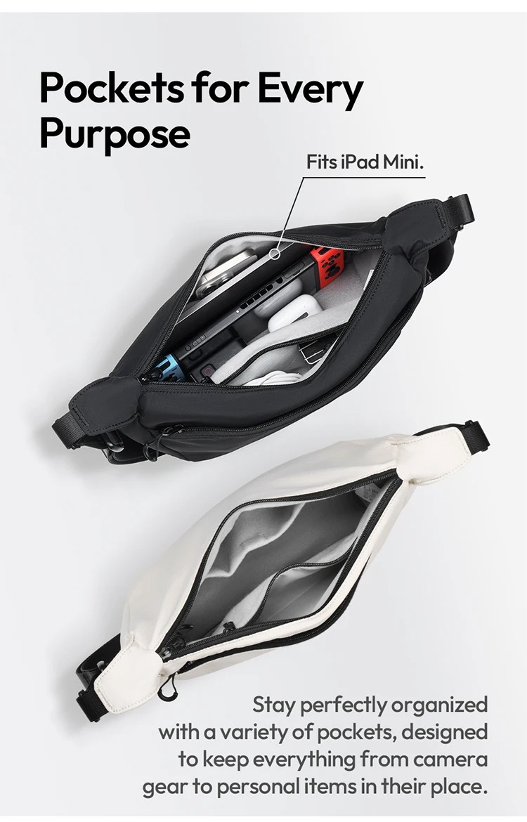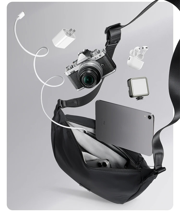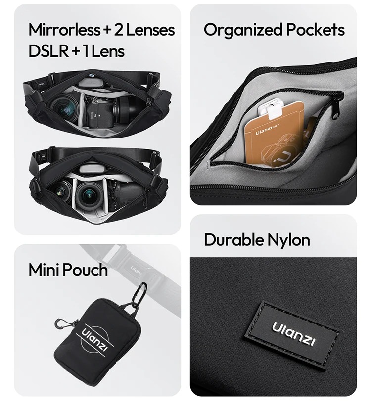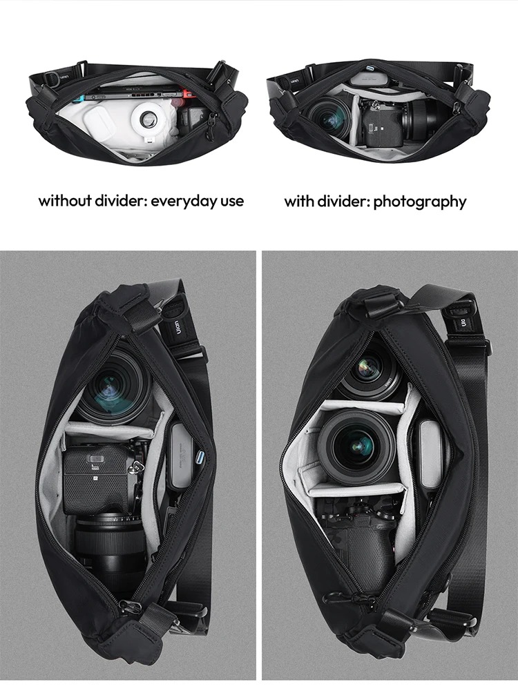 - Ngăn chính rộng rãi có thể chứa thoải mái một máy ảnh không gương lật có hai ống kính hoặc một máy ảnh DSLR có một ống kính
