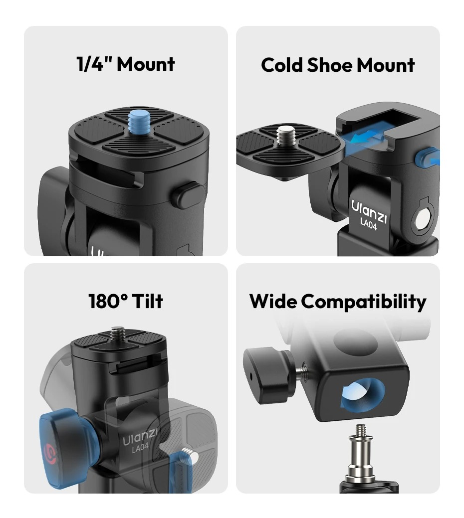 - Giá đỡ đa năng 1/4" giúp bạn dễ dàng gắn nhiều loại phụ kiện như giá đỡ điện thoại, máy ảnh và đèn chiếu sáng.