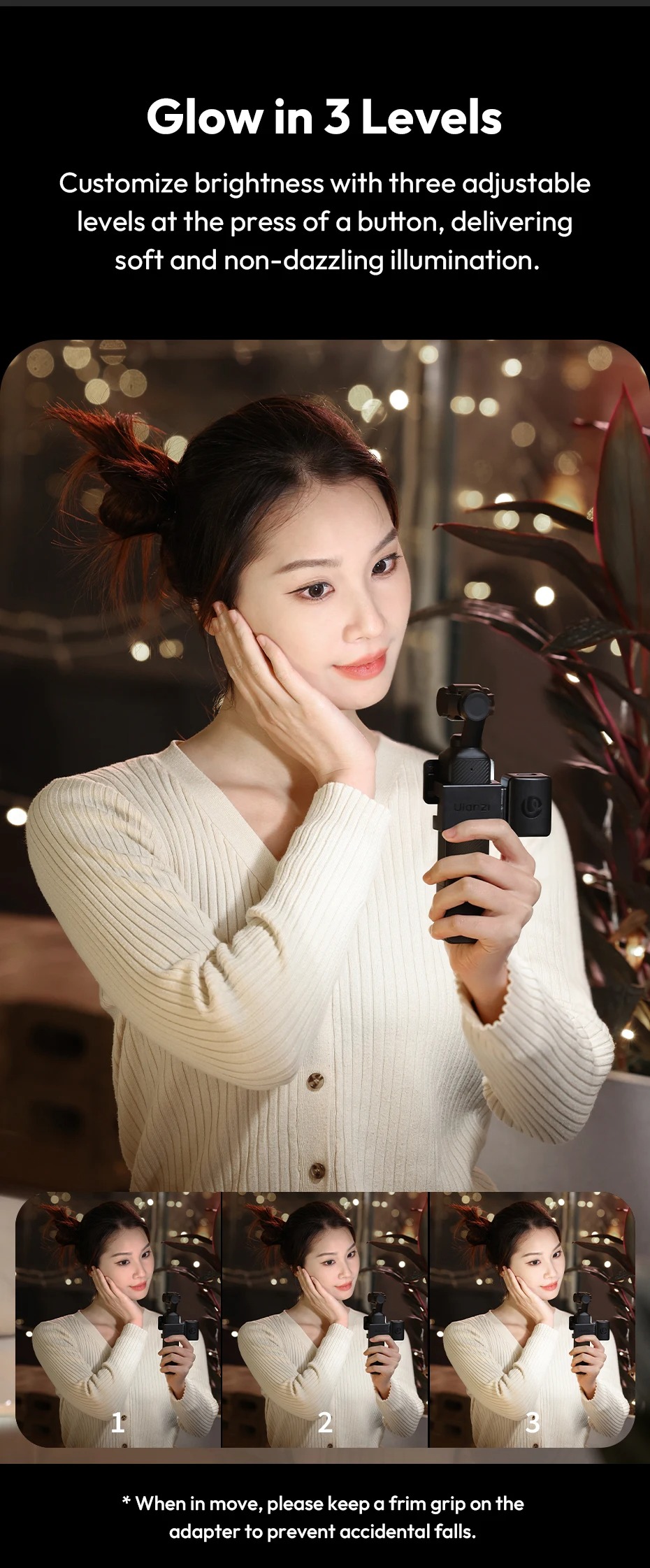 - Gắn bộ chuyển đổi vào Pocket 3, sau đó gắn đèn vào mặt nam châm trên bộ chuyển đổi để tận hưởng ánh sáng dễ dàng.