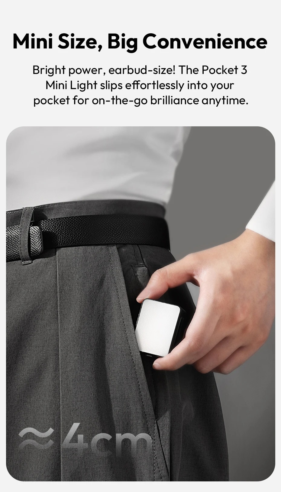 - Công suất mạnh mẽ, kích thước nhỏ gọn như tai nghe! Đèn Pocket 3 Mini Light dễ dàng bỏ vào túi để tỏa sáng mọi lúc mọi nơi.