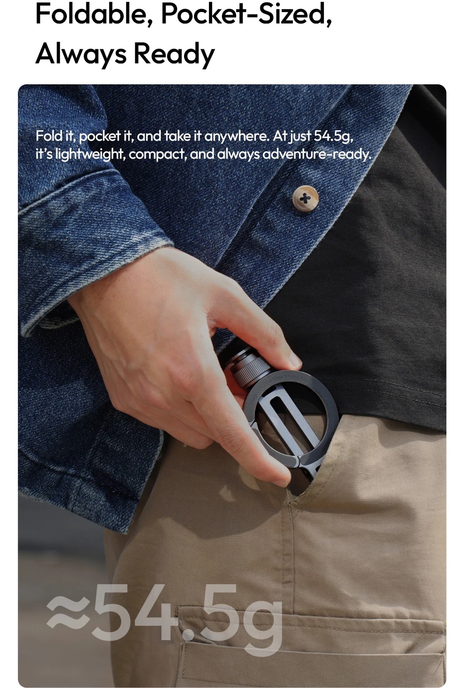 - Gấp lại, bỏ túi và mang đi bất cứ đâu. Chỉ nặng 54,5g, nhẹ, nhỏ gọn và luôn sẵn sàng cho cuộc phiêu lưu.