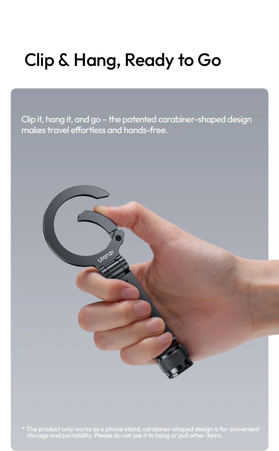- Thiết kế hình carabiner được cấp bằng sáng chế giúp việc di chuyển trở nên dễ dàng