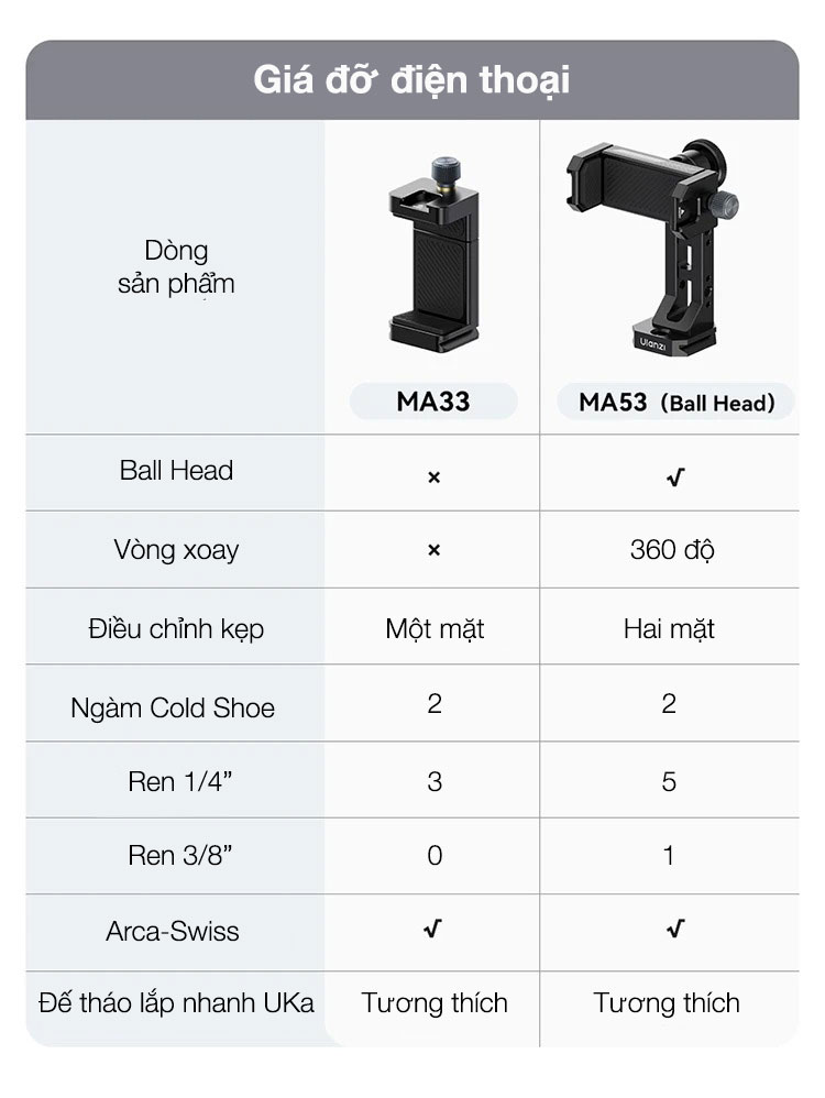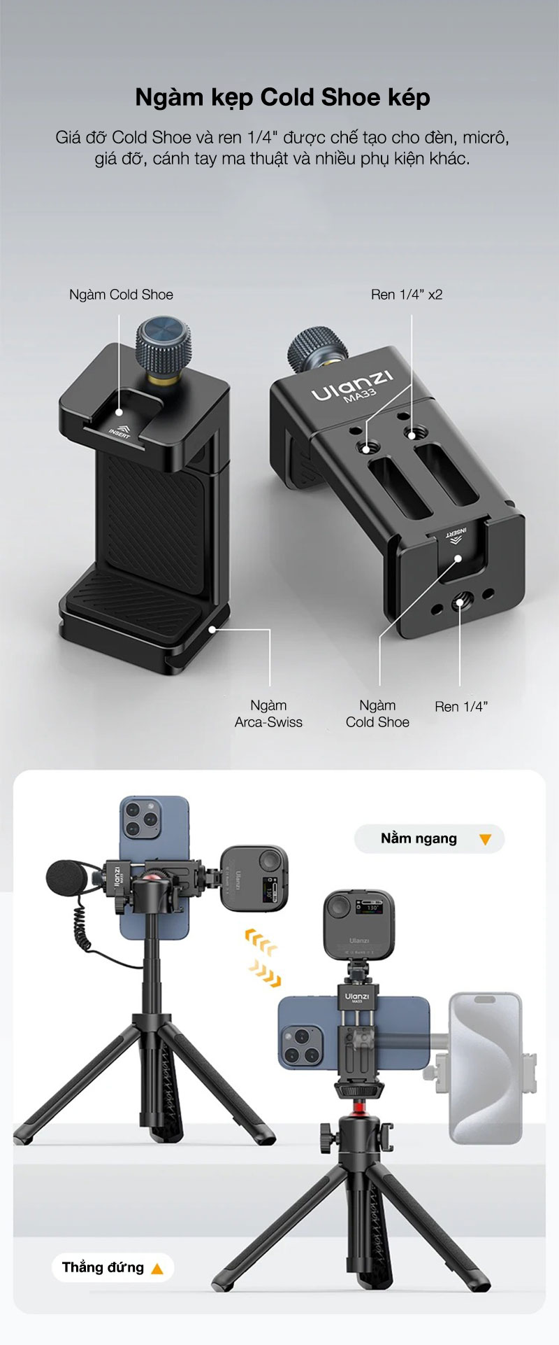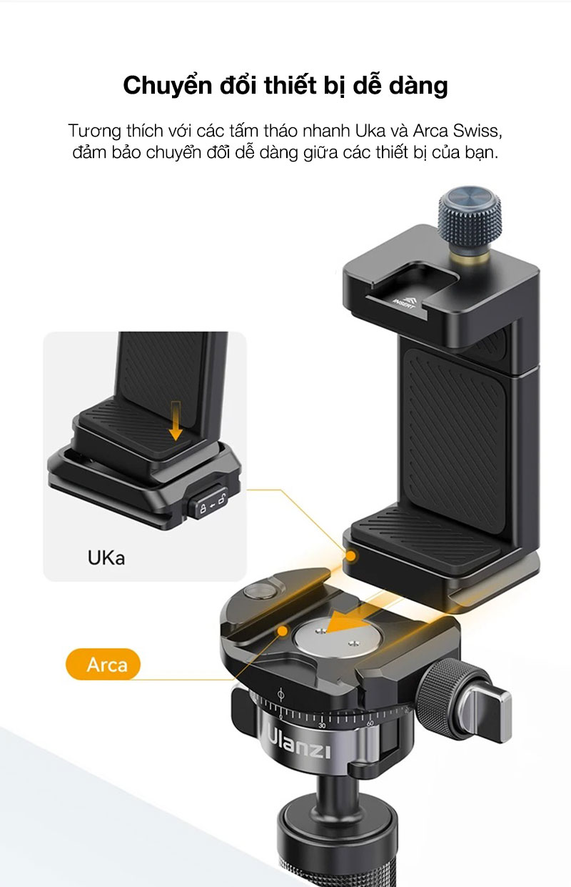 - Phần đế tích hợp ngàm 1/4'', arca swiss dễ dàng kết nối với nhiều loại phụ kiện khác