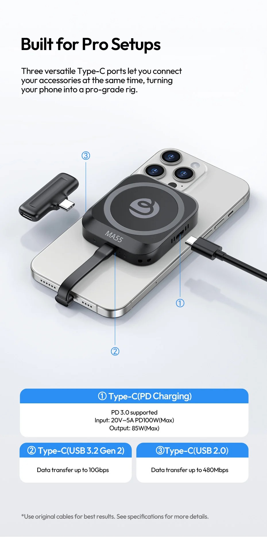 - Cổng Type C (PD Charging): PD 3.0 Support, Input: 20V-5A (Max 100W), Output: Up to 85W