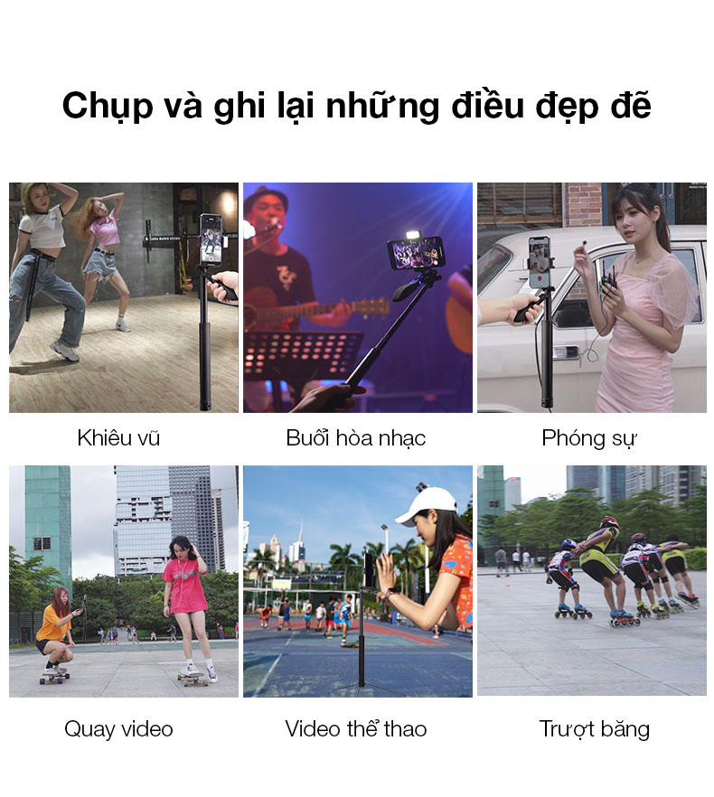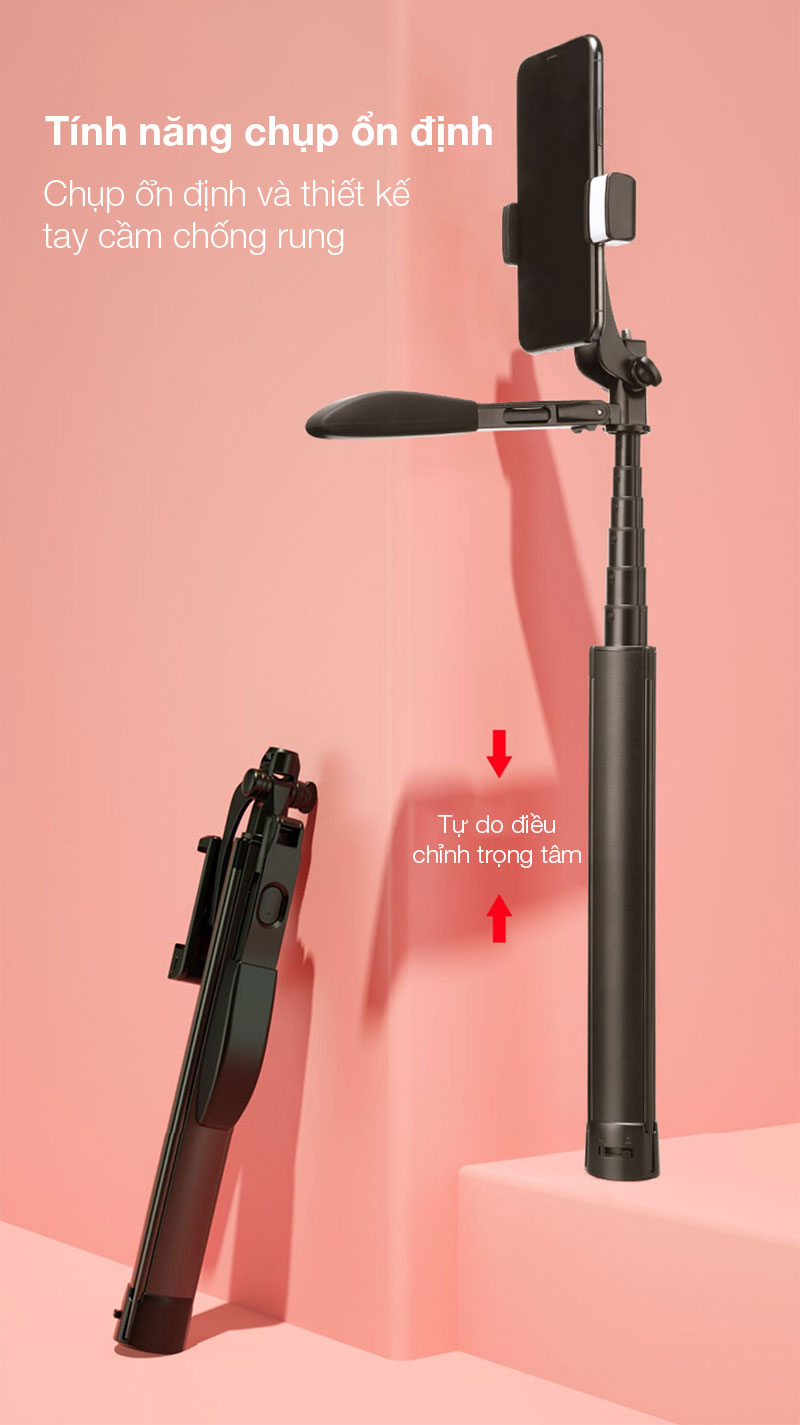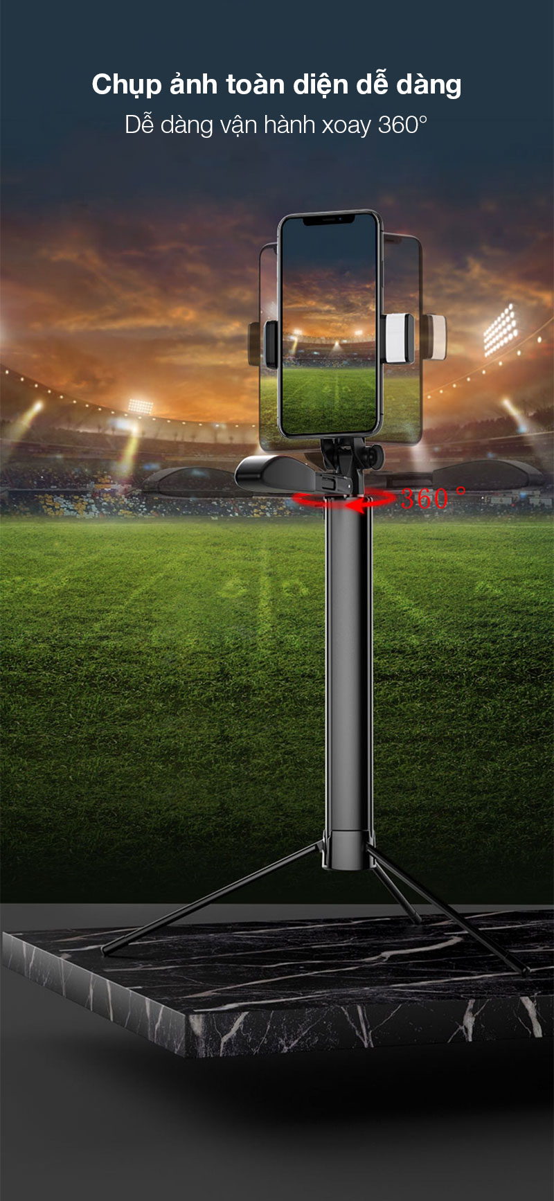 - Chân máy chụp ảnh tự sướng tất cả trong một. Tích hợp bộ ổn định, giá ba chân và gậy chụp ảnh tự sướng, có đầu xoay mượt mà 360 °, bộ điều khiển từ xa không dây, tay cầm chống rung khi chụp ổn định, chân đế kim loại có trọng lượng cân bằng và tích hợp chân kiềng ẩn. Được thiết kế cho người dùng YouTube và người sáng tạo nội dung theo nhu cầu chụp ảnh tự sướng và chụp ảnh.