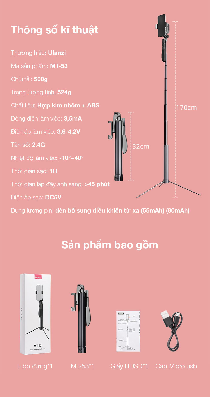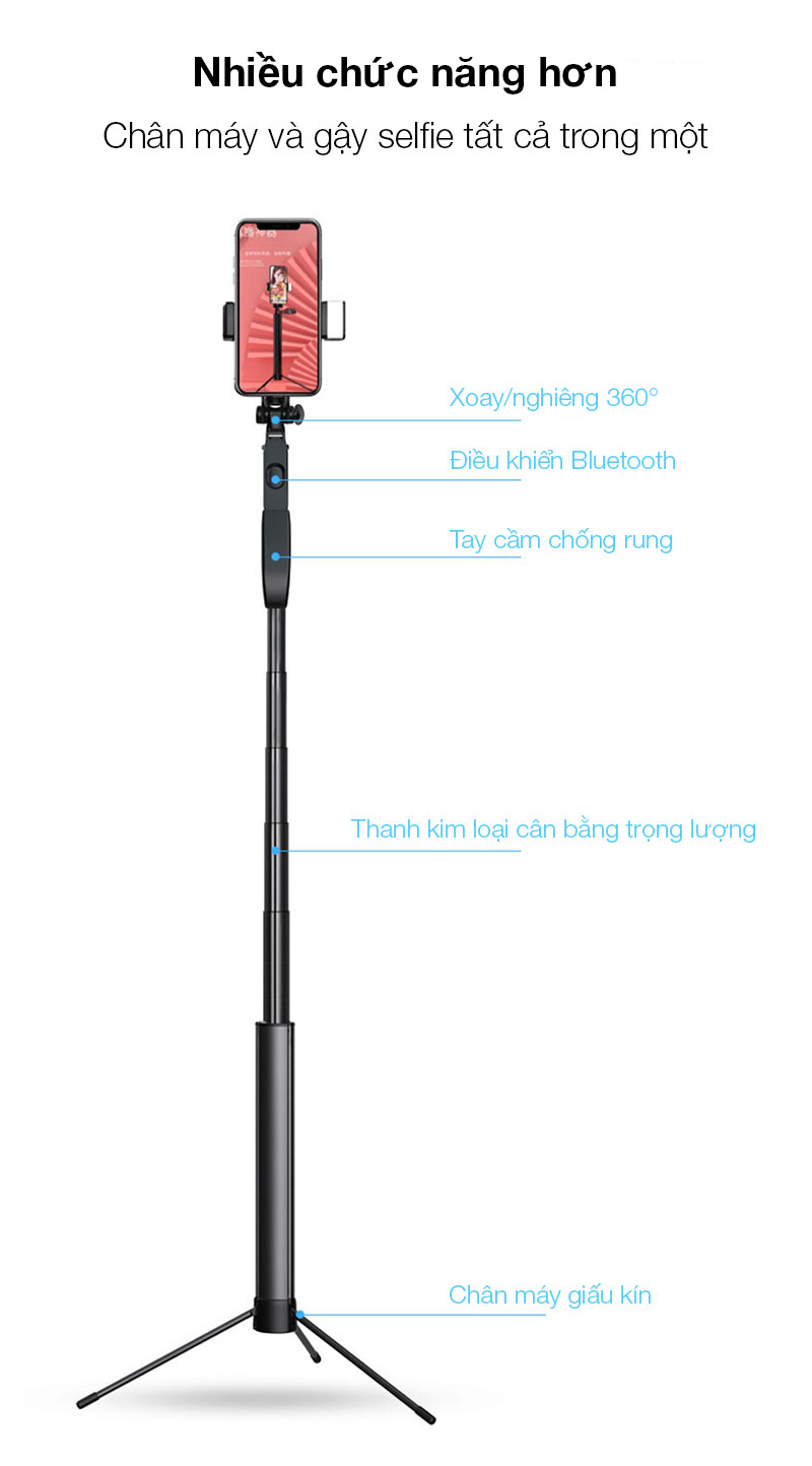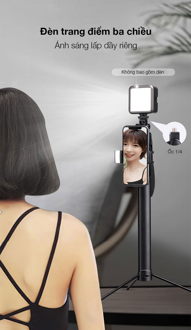 - Chân máy chụp ảnh tự sướng tất cả trong một. Tích hợp bộ ổn định, giá ba chân và gậy chụp ảnh tự sướng, có đầu xoay mượt mà 360 °, bộ điều khiển từ xa không dây, tay cầm chống rung khi chụp ổn định, chân đế kim loại có trọng lượng cân bằng và tích hợp chân kiềng ẩn. Được thiết kế cho người dùng YouTube và người sáng tạo nội dung theo nhu cầu chụp ảnh tự sướng và chụp ảnh.