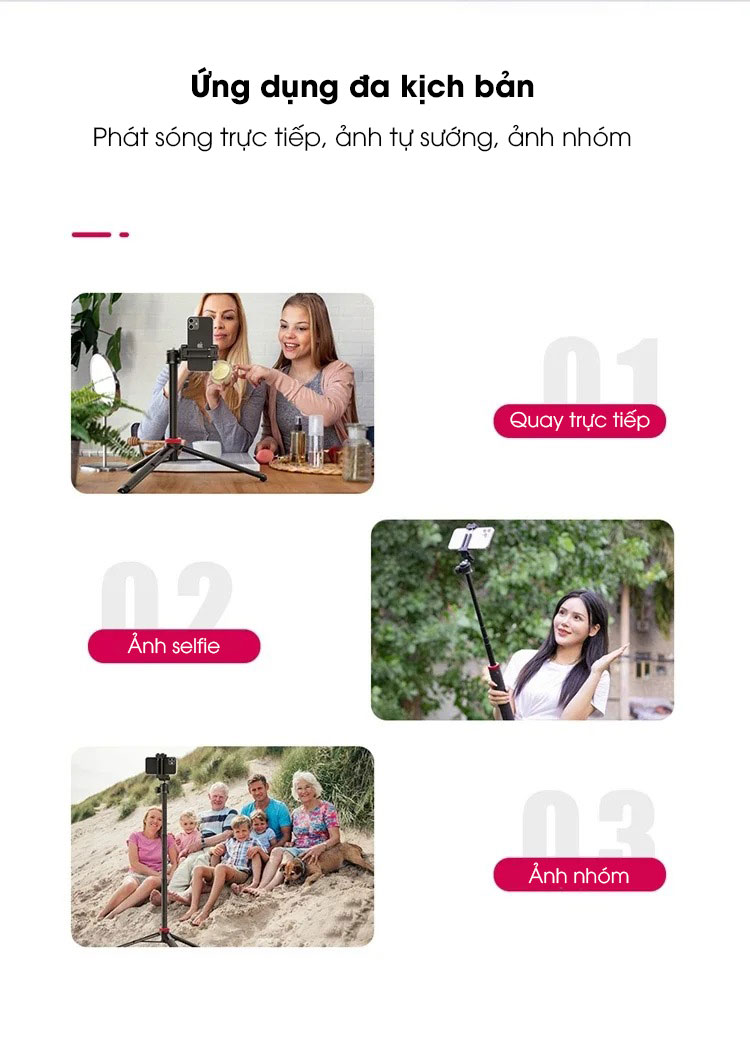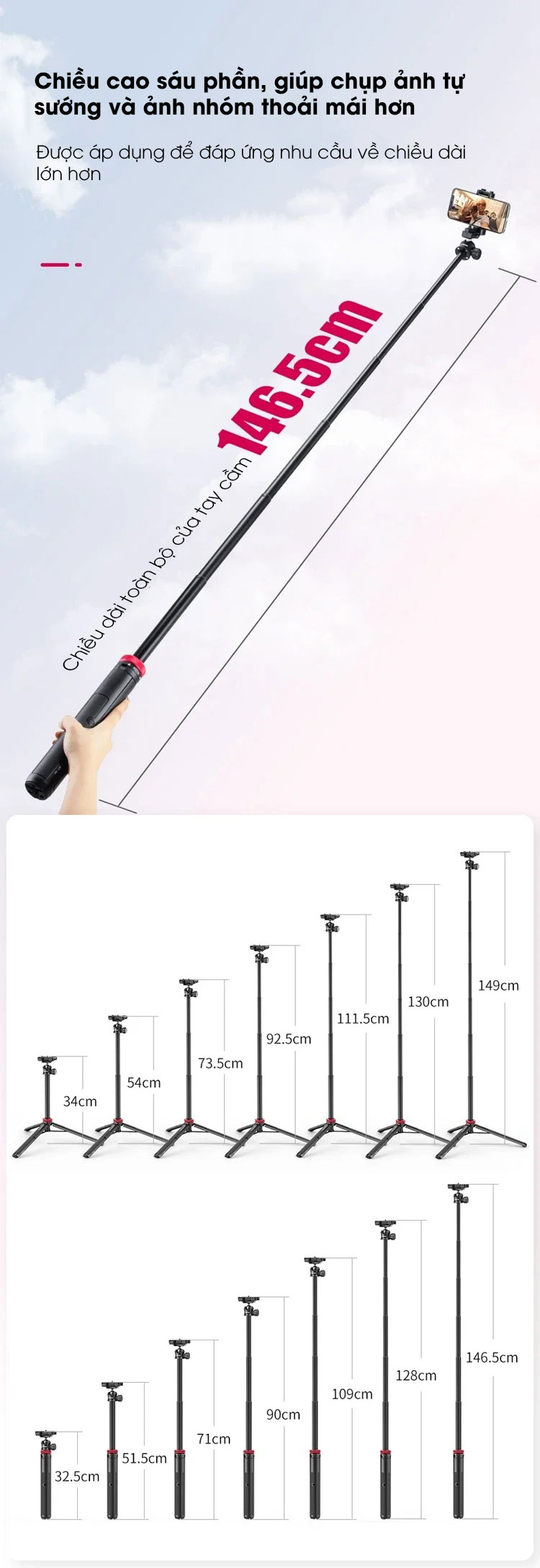 - Có thể mở rộng 4 phần: Chiều dài có thể được điều chỉnh từ 32,5cm đến 109cm, có thể đáp ứng nhiều nhu cầu khác nhau của bạn, thích hợp để phát trực tiếp, quay video Vlog, tự sướng, chụp ảnh góc cao, chụp ảnh trong chuyến đi, v.v.