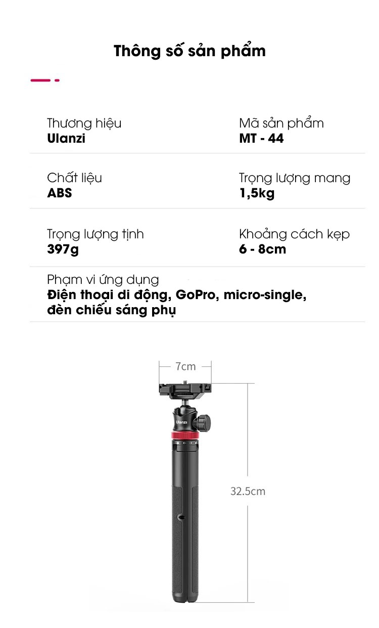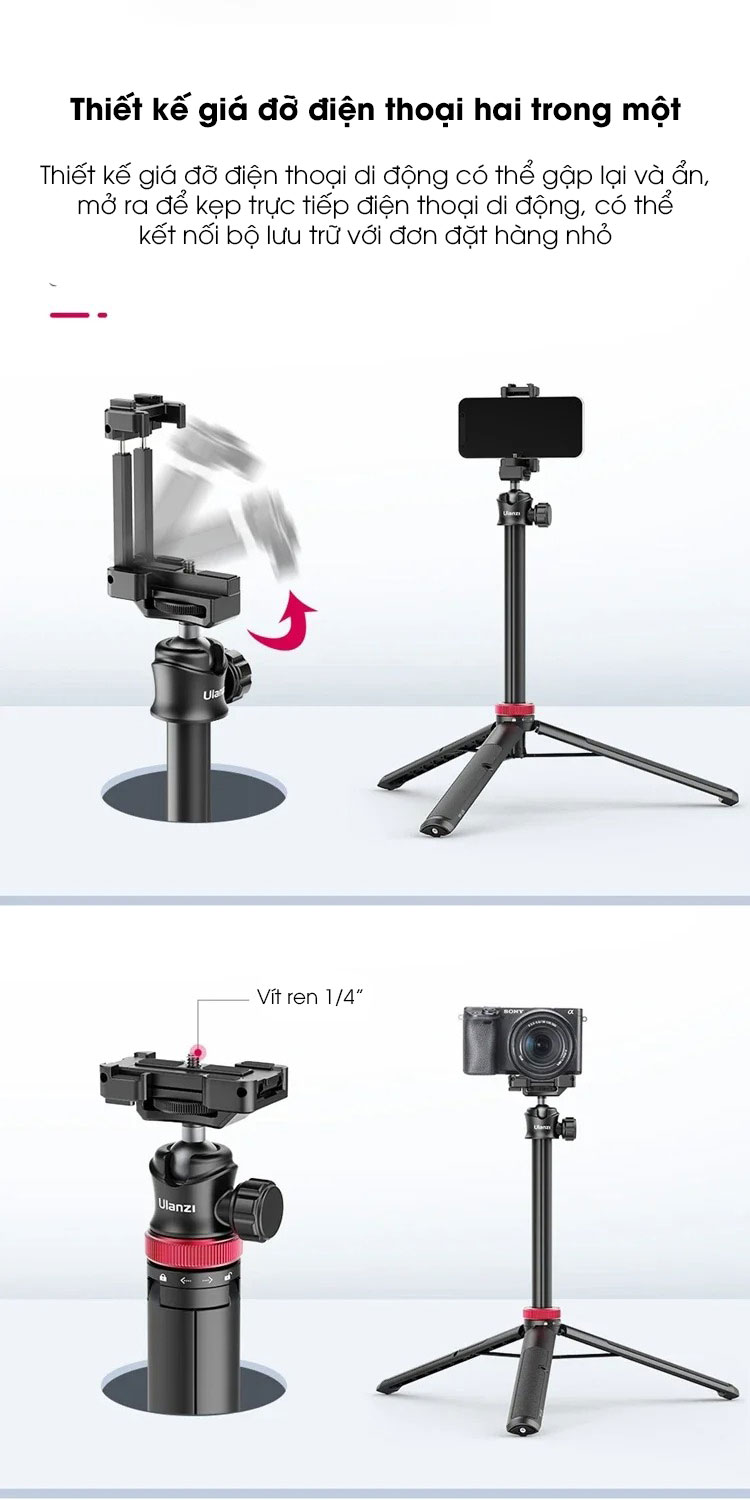 - Vít 1/4 inch tiêu chuẩn: Tương thích với hầu hết các máy ảnh và một số kẹp điện thoại thông minh, nhiều chức năng trong một thiết bị, đáp ứng các nhu cầu khác nhau của bạn.