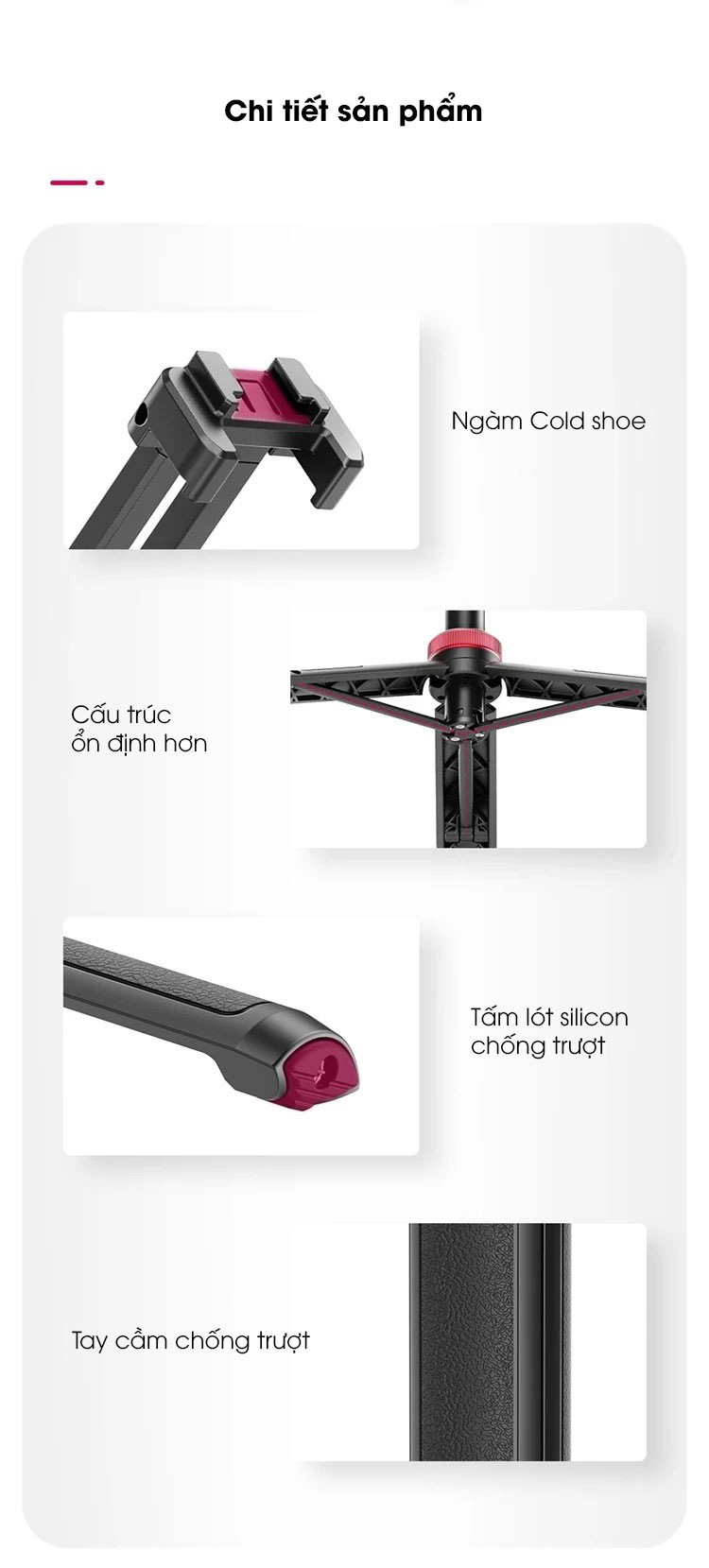 - Thiết kế kẹp điện thoại đặc biệt: Tấm tháo nhanh có thể được mở ra để trở thành kẹp điện thoại với giá đỡ giày lạnh, đèn video LED mini có thể dễ dàng gắn trên đó.