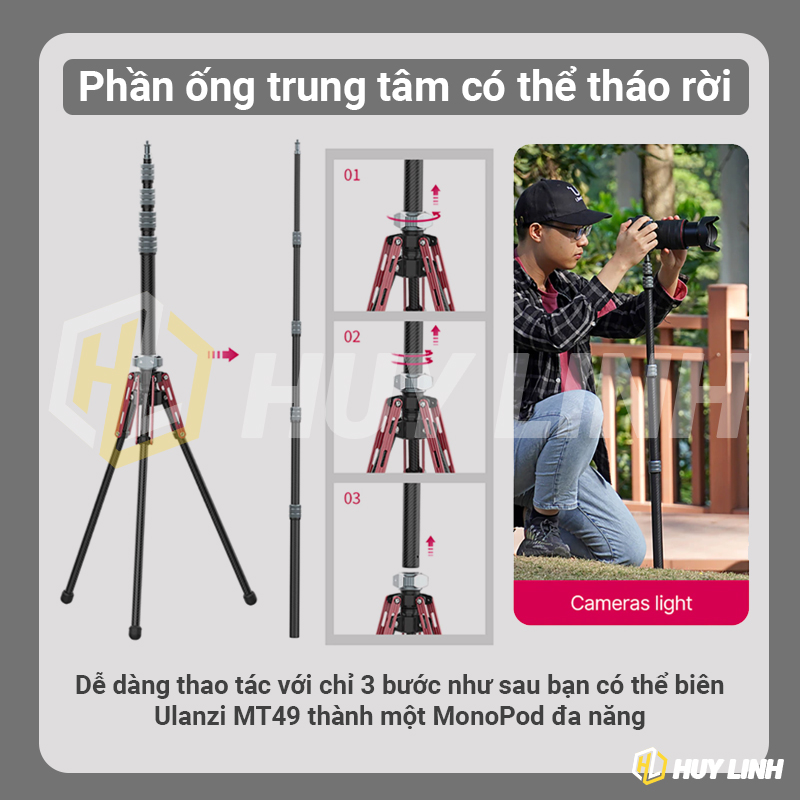 Ulanzi MT-49 Carbon Fiber Tripod được làm hoàn toàn bằng sợi carbon có độ bền cao, trọng lượng nhẹ chỉ 0.79kg. Đặc biệt, trục giữa của tripod 3 chân Ulanzi MT-49 có thể tháo rời để sử dụng như monopod hay gậy chụp hình selfie cầm tay vô cùng tiện lợi. Ngoài ra, chân tripod Ulanzi MT-49 có chiều dài tối đa lên tới 197cm và chiều dài gấp gọn chỉ 47cm cùng trọng lượng nhẹ dễ dàng mang theo sử dụng ngoài trời. Đi kèm đầu chuyển từ 1/4 qua ren 16mm Ulanzi MT-49 có thể dùng làm chân đèn studio kết hợp đèn flash + softbox dù tản sáng, hoặc dùng cho Camera chụp ảnh phong cảnh, quay video ... đa năng.