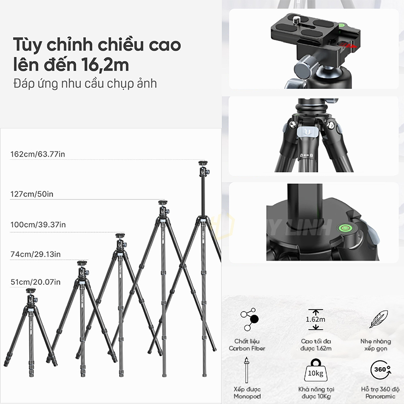 - Tự do điều chỉnh chiều cao của giá ba chân, lên tới 162cm.