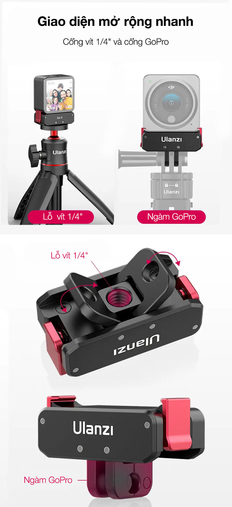 - Hỗ trợ kết nối qua cả đế nam châm và mount gopro, tăng khả năng tương thích